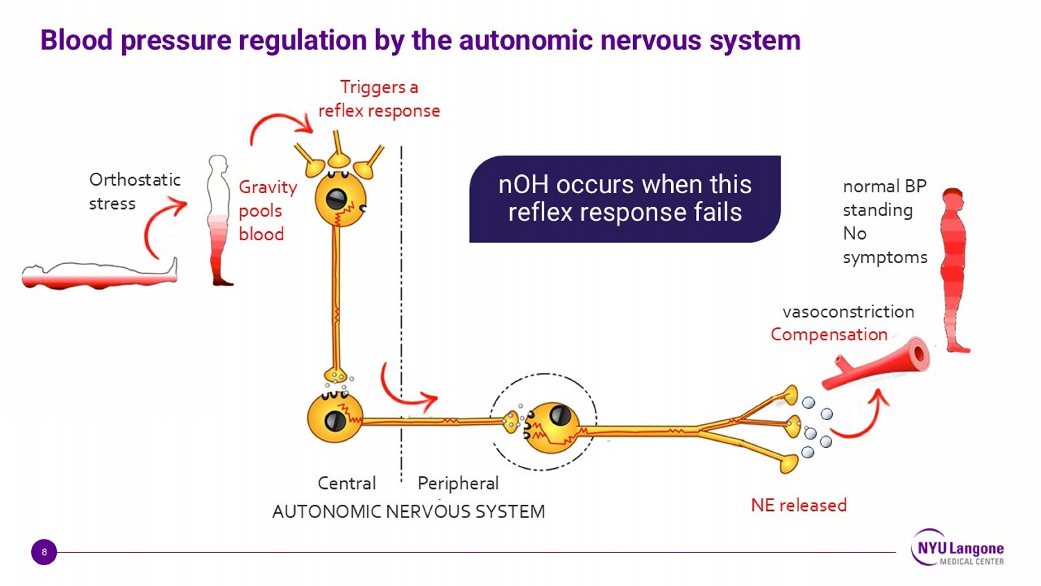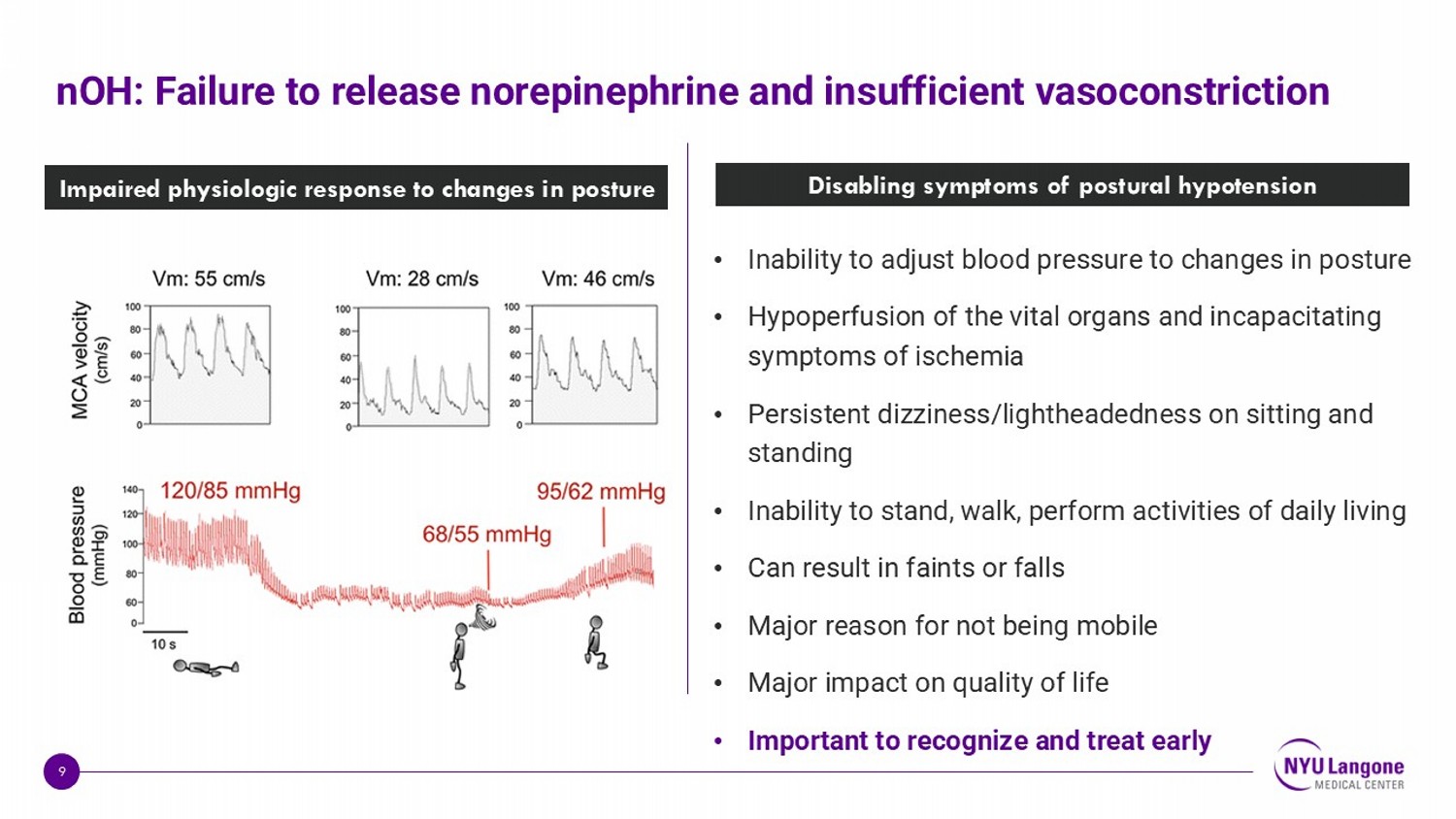 8 Blood pressure regulation by the autonomic nervous system Triggers a reflex response NE released vasoconstriction Compensation normal BP standing No symptoms Central Peripheral AUTONOMIC NERVOUS SYSTEM nOH occurs when this reflex response fails Gravity pools blood Orthostatic stress