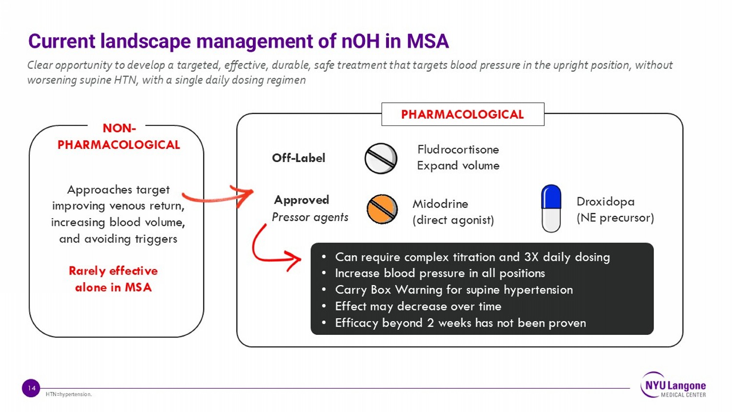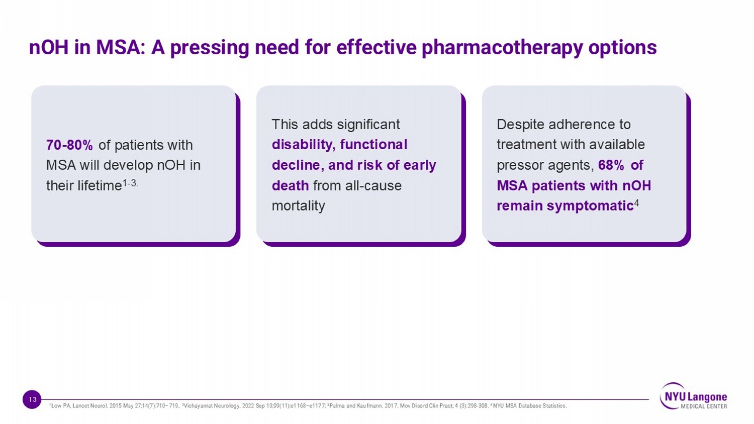 13 70 - 80% of patients with MSA will develop nOH in their lifetime 1 - 3. This adds significant disability, functional decline, and risk of early death from all - cause mortality Despite adherence to treatment with available pressor agents, 68% of MSA patients with nOH remain symptomatic 4 nOH in MSA: A pressing need for effective pharmacotherapy options 1 Low PA, Lancet Neurol. 2015 May 27;14(7):710 – 719, 2 Vichayanrat Neurology. 2022 Sep 13;99(11):e1168 – e1177; 3 Palma and Kaufmann. 2017. Mov Disord Clin Pract ; 4 (3):298 - 308. 4 NYU MSA Database Statistics.