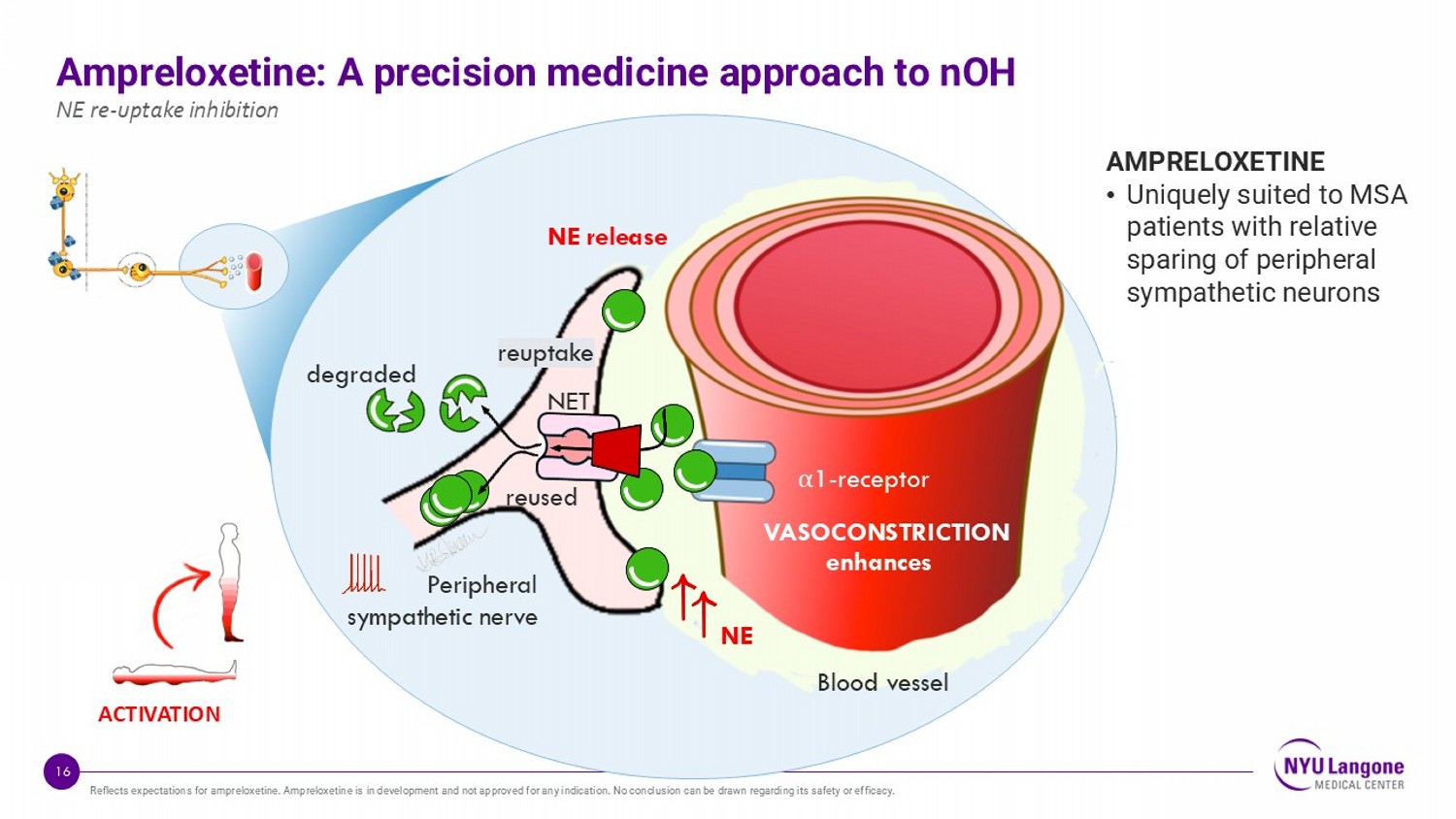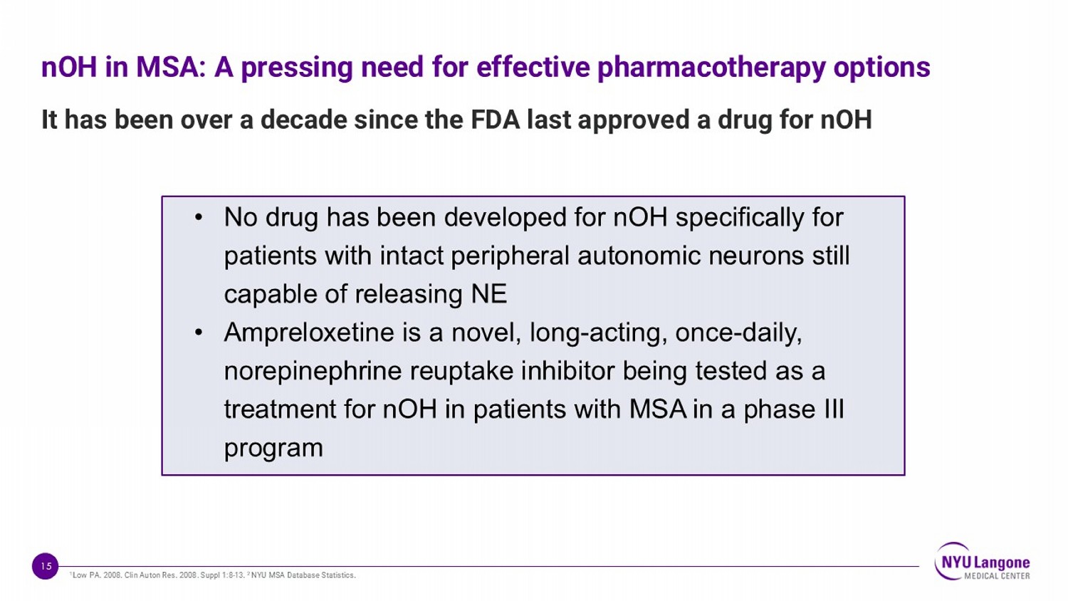 15 nOH in MSA: A pressing need for effective pharmacotherapy options It has been over a decade since the FDA last approved a drug for nOH 1 Low PA. 2008. Clin Auton Res. 2008. Suppl 1:8 - 13. 2 NYU MSA Database Statistics. • No drug has been developed for nOH specifically for patients with intact peripheral autonomic neurons still capable of releasing NE • Ampreloxetine is a novel, long - acting, once - daily, norepinephrine reuptake inhibitor being tested as a treatment for nOH in patients with MSA in a phase III program