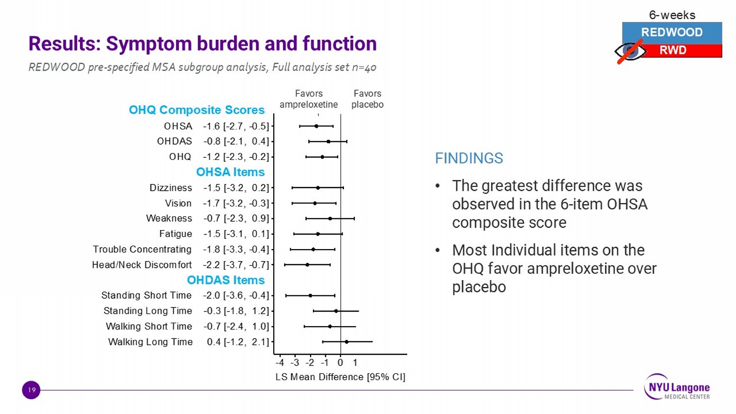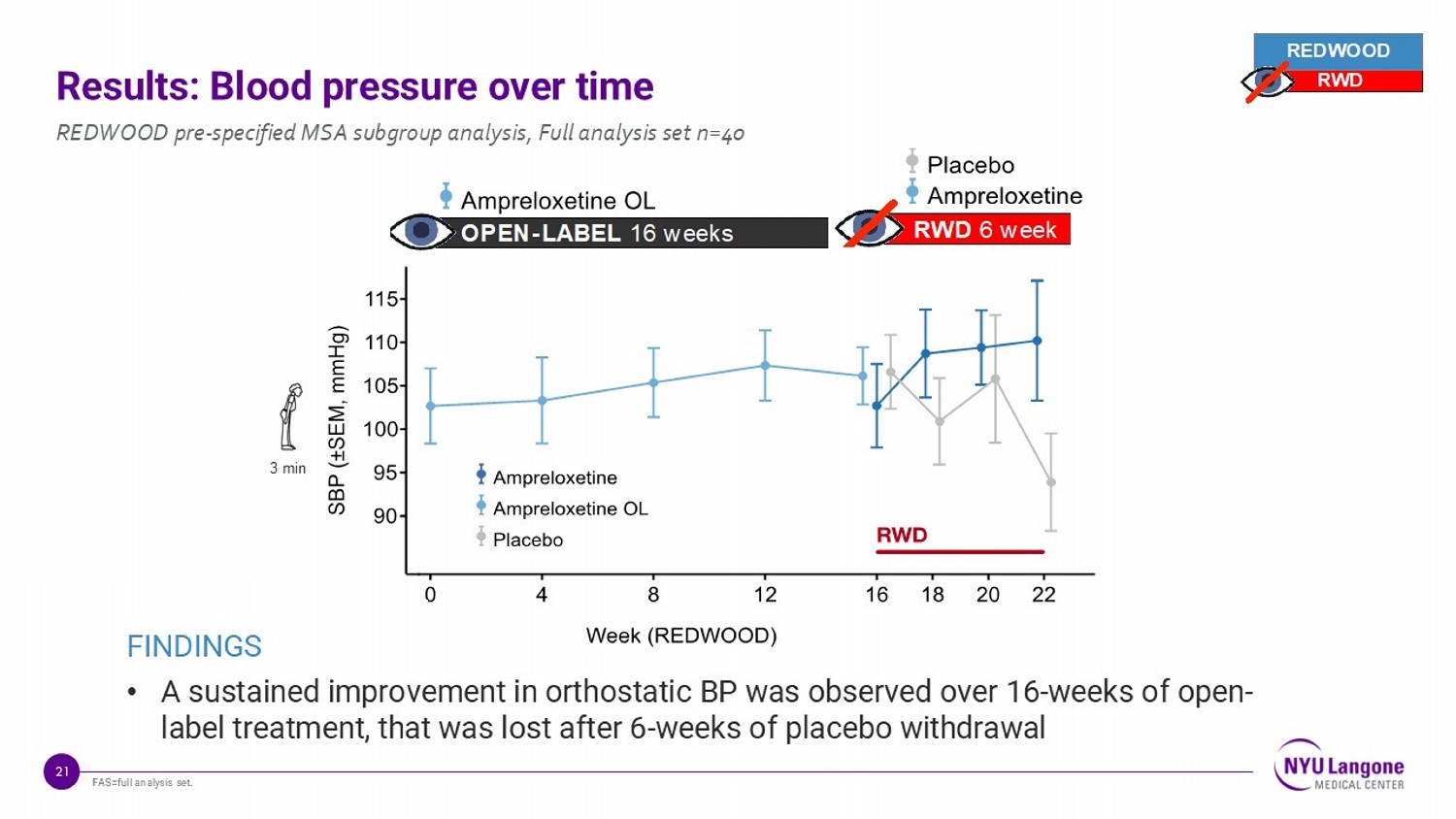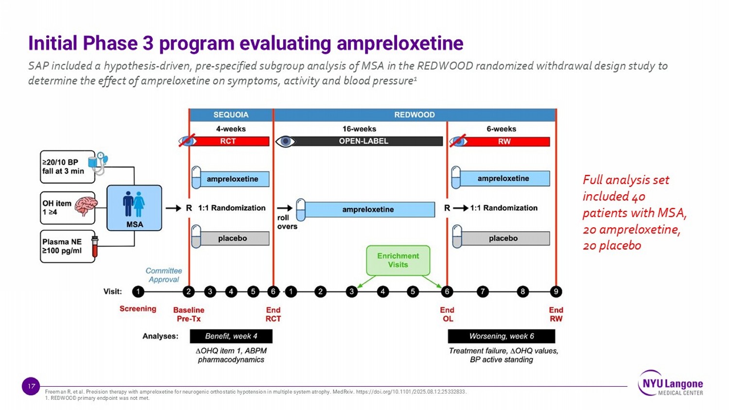 17 Initial Phase 3 program evaluating ampreloxetine SAP included a hypothesis - driven, pre - specified subgroup analysis of MSA in the REDWOOD randomized withdrawal design study to determine the effect of ampreloxetine on symptoms, activity and blood pressure 1 Freeman R, et al. Precision therapy with ampreloxetine for neurogenic orthostatic hypotension in multiple system atrophy. MedRxiv . https://doi.org/10.1101/2025.08.12.25332833. 1. REDWOOD primary endpoint was not met. Full analysis set included 40 patients with MSA, 20 ampreloxetine , 20 placebo