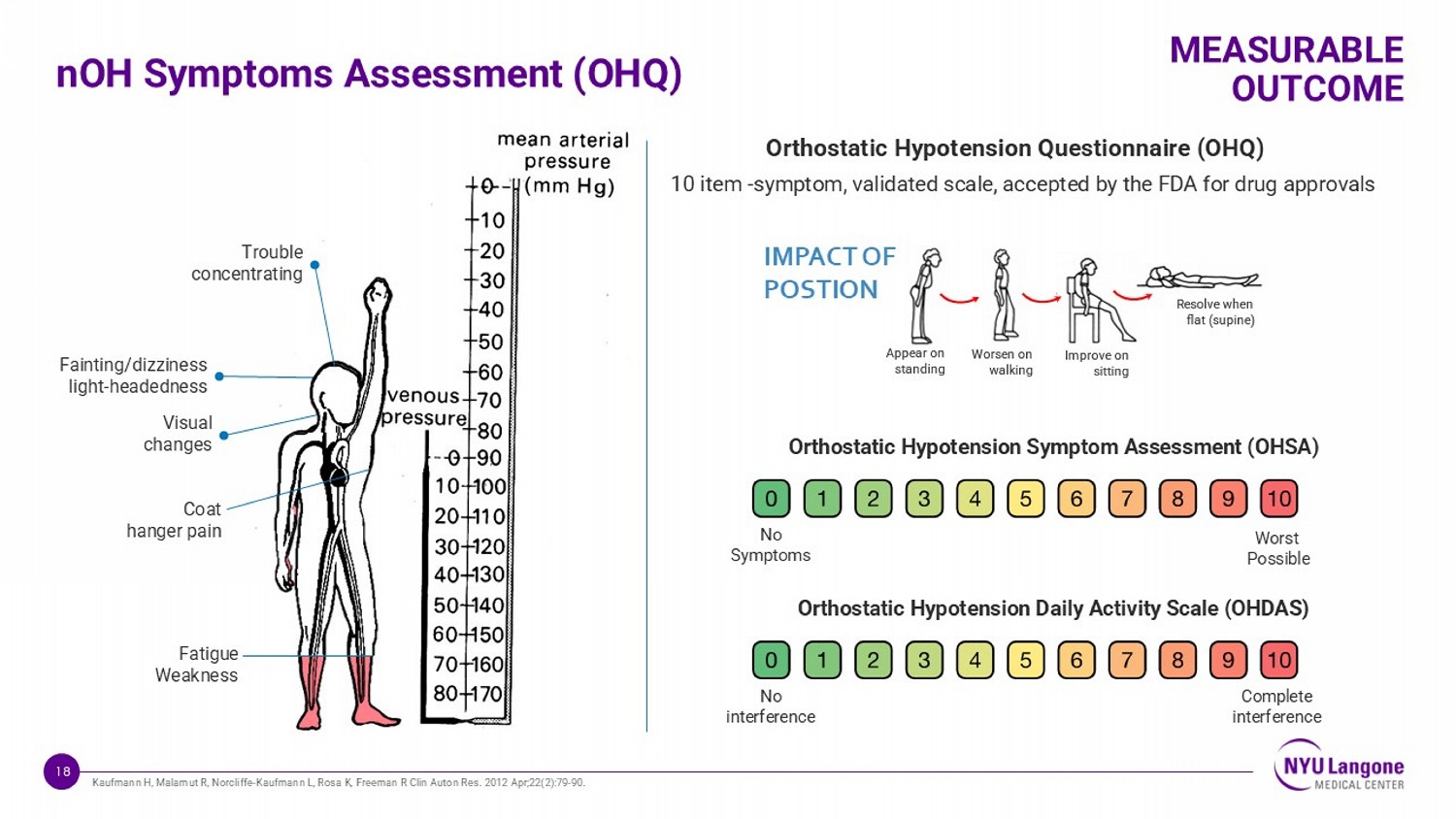 18 Worst Possible Orthostatic Hypotension Symptom Assessment (OHSA) 1 0 item - symptom, validated scale, accepted by the FDA for drug approvals nOH Symptoms Assessment (OHQ) MEASURABLE OUTCOME Orthostatic Hypotension Questionnaire (OHQ) No Symptoms Complete interference Orthostatic Hypotension Daily Activity Scale (OHDAS) No interference &UUJFWTS XYFSINSL <TWXJSTS \FQPNSL .RUWT[JTS XNYYNSL 7JXTQ[J\MJS ܫFY XZUNSJ ,03$&72)326,7,21 IMPACT OF POSTION Fainting/dizziness light - headedness Visual changes Fatigue Weakness Coat hanger pain Trouble concentrating Kaufmann H, Malamut R, Norcliffe - Kaufmann L, Rosa K, Freeman R Clin Auton Res. 2012 Apr;22(2):79 - 90.