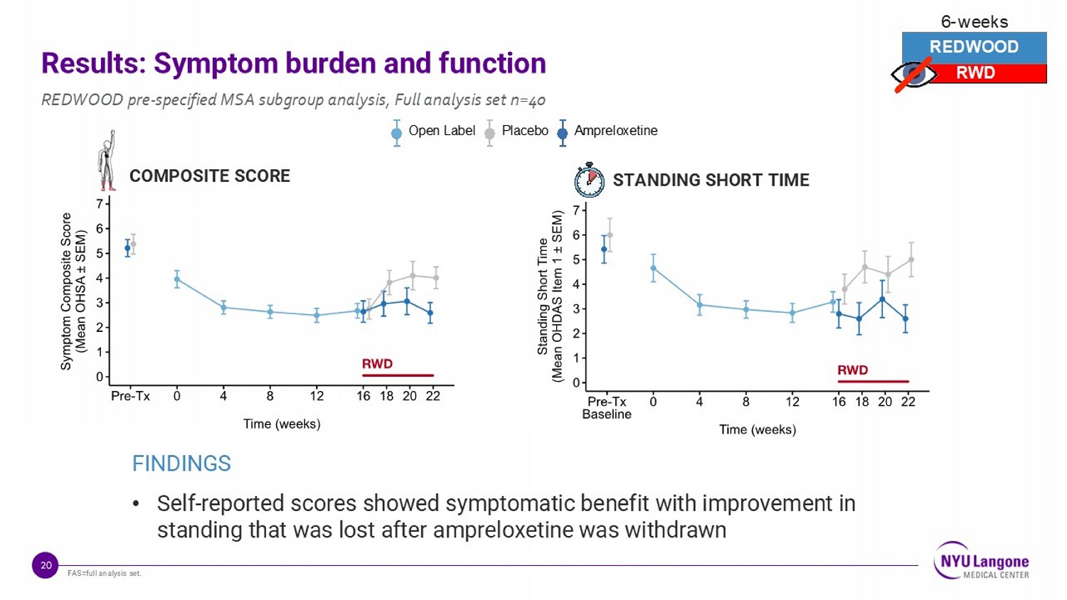 19 Results: Symptom burden and function REDWOOD pre - specified MSA subgroup analysis, Full analysis set n=40 OHSA -1.6 [-2.7, -0.5] Dizziness -1.5 [-3.2, 0.2] Vision -1.7 [-3.2, -0.3] Weakness -0.7 [-2.3, 0.9] Fatigue -1.5 [-3.1, 0.1] Trouble Concentrating -1.8 [-3.3, -0.4] Head/Neck Discomfort -2.2 [-3.7, -0.7] OHDAS -0.8 [-2.1, 0.4] Standing Short Time -2.0 [-3.6, -0.4] Standing Long Time -0.3 [-1.8, 1.2] Walking Short Time -0.7 [-2.4, 1.0] Walking Long Time 0.4 [-1.2, 2.1] OHQ -1.2 [-2.3, -0.2] -4 -3 -2 -1 0 1 LS Mean Difference [95% CI] OHQ Composite Scores OHSA Items OHDAS Items FINDINGS • The greatest difference was observed in the 6 - item OHSA composite score • Most Individual items on the OHQ favor ampreloxetine over placebo Favors ampreloxetine Favors placebo