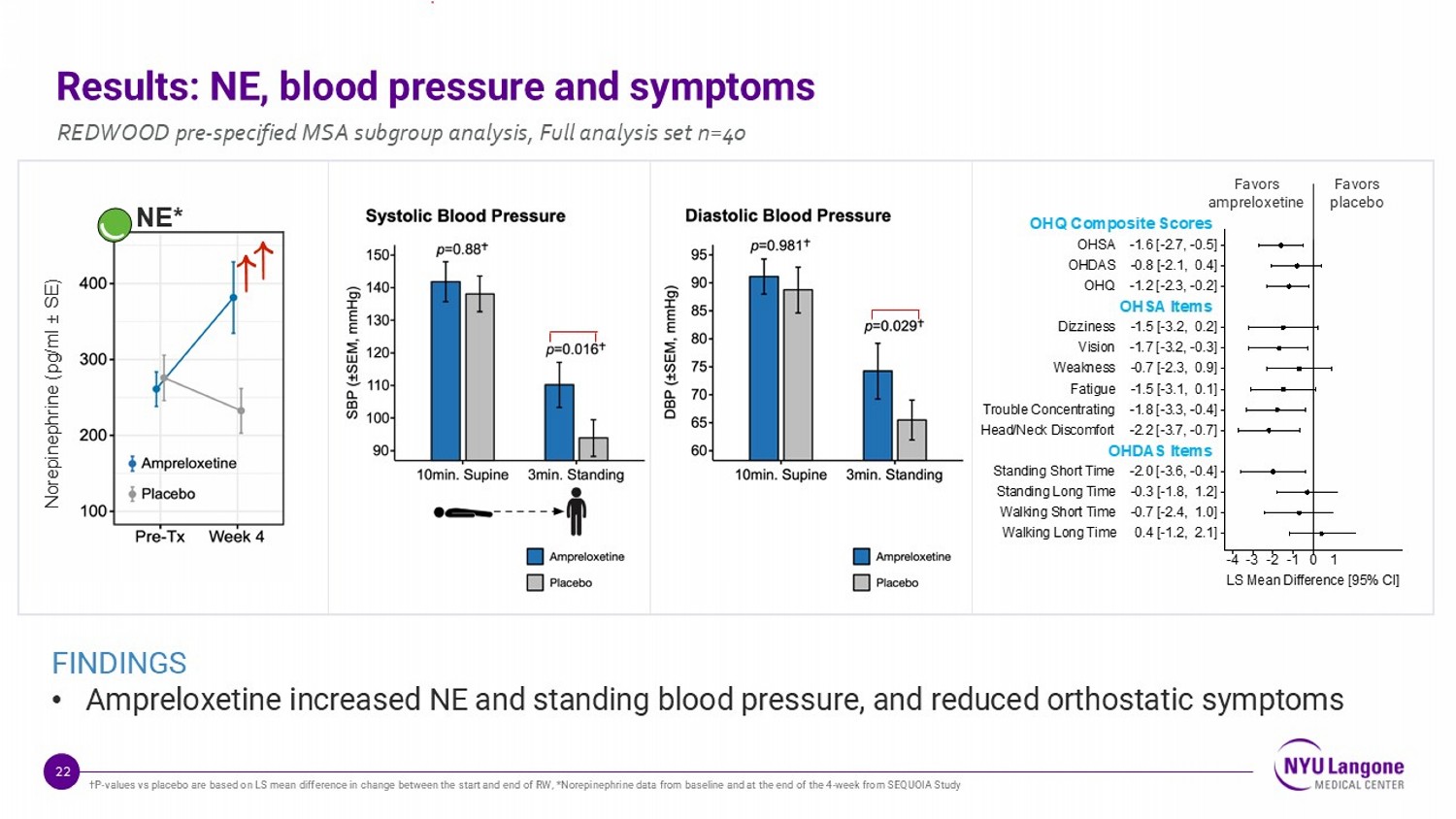 21 FINDINGS • A sustained improvement in orthostatic BP was observed over 16 - weeks of open - label treatment, that was lost after 6 - weeks of placebo withdrawal Results: Blood pressure over time OPEN-LABEL 16 weeks RWD 6 week 3 min FAS=full analysis set. REDWOOD pre - specified MSA subgroup analysis, Full analysis set n=40