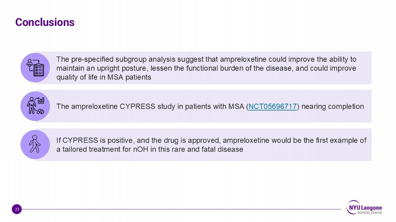23 The pre - specified subgroup analysis suggest that ampreloxetine could improve the ability to maintain an upright posture, lessen the functional burden of the disease, and could improve quality of life in MSA patients The ampreloxetine CYPRESS study in patients with MSA ( NCT05696717 ) nearing completion If CYPRESS is positive, and the drug is approved, ampreloxetine would be the first example of a tailored treatment for nOH in this rare and fatal disease Conclusions