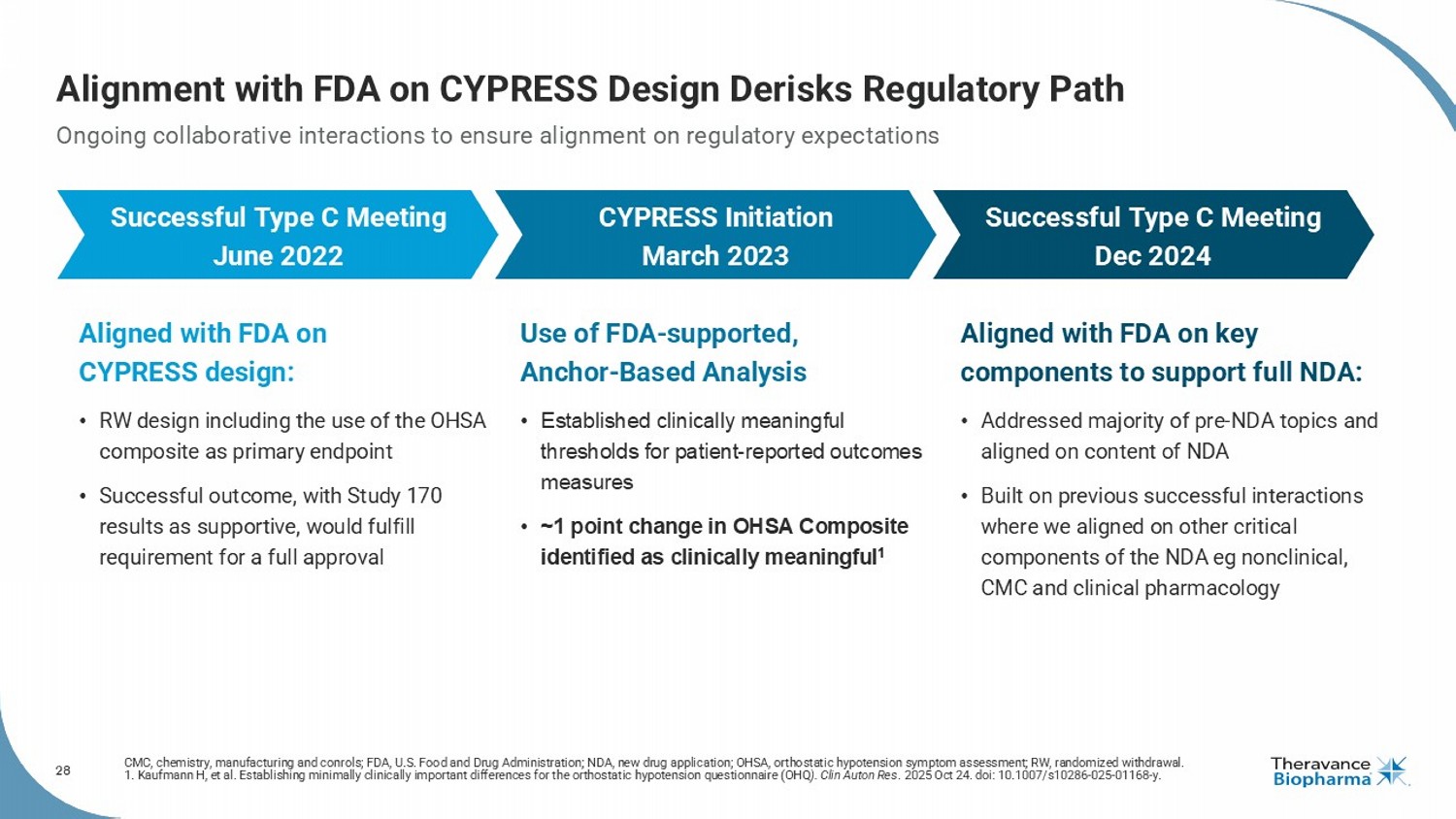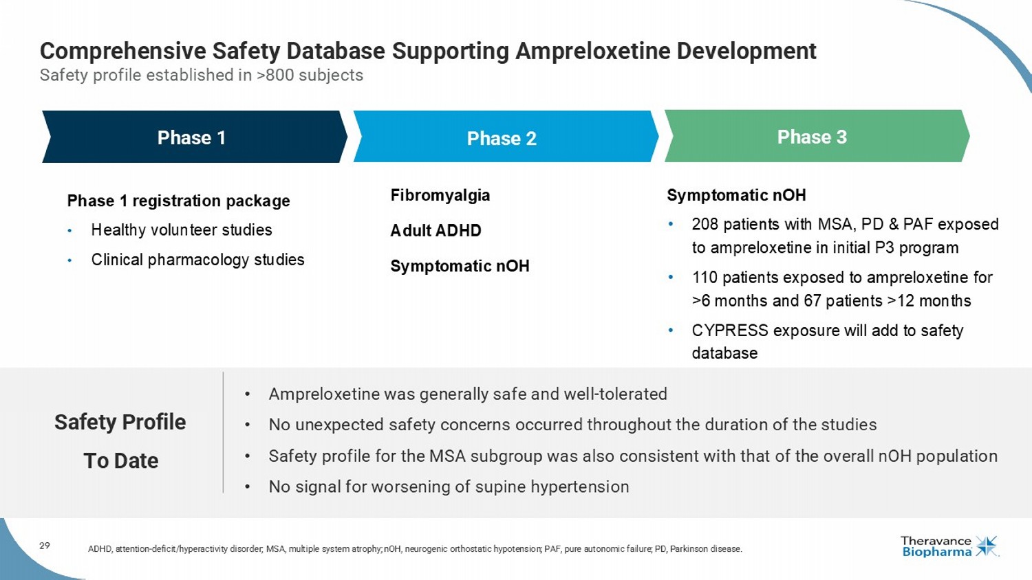 28 Alignment with FDA on CYPRESS Design Derisks Regulatory Path CMC, chemistry, manufacturing and conrols; FDA, U.S. Food and Drug Administration; NDA, new drug application; OHSA, orthostatic hypotension symptom assessment; RW, randomized withdrawal. 1. Kaufmann H, et al. Establishing minimally clinically important differences for the orthostatic hypotension questionnaire ( OHQ ). Clin Auton Res . 2025 Oct 24. doi : 10.1007/s10286 - 025 - 01168 - y. Aligned with FDA on CYPRESS design: • RW design including the use of the OHSA composite as primary endpoint • Successful outcome, with Study 170 results as supportive, would fulfill requirement for a full approval Ongoing collaborative interactions to ensure alignment on regulatory expectations Use of FDA - supported, Anchor - Based Analysis • Established clinically meaningful thresholds for patient - reported outcomes measures • ~1 point change in OHSA Composite identified as clinically meaningful 1 Aligned with FDA on key components to support full NDA: • Addressed majority of pre - NDA topics and aligned on content of NDA • Built on previous successful interactions where we aligned on other critical components of the NDA eg nonclinical, CMC and clinical pharmacology Successful Type C Meeting June 2022 CYPRESS Initiation March 2023 Successful Type C Meeting Dec 2024