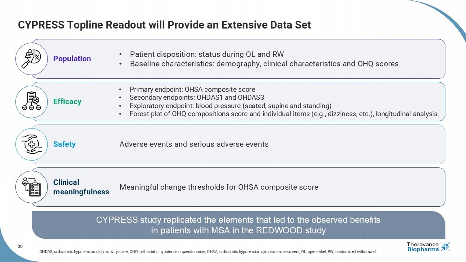 29 Comprehensive Safety Database Supporting Ampreloxetine Development Safety profile established in >800 subjects ADHD, attention - deficit/hyperactivity disorder; MSA, multiple system atrophy; nOH , neurogenic orthostatic hypotension; PAF, pure autonomic failure; PD, Parkinson disease. 29 Phase 2 Phase 3 Phase 1 registration package • Healthy volunteer studies • Clinical pharmacology studies • Ampreloxetine was generally safe and well - tolerated • No unexpected safety concerns occurred throughout the duration of the studies • Safety profile for the MSA subgroup was also consistent with that of the overall nOH population • No signal for worsening of supine hypertension Phase 1 Safety Profile To Date Fibromyalgia Adult ADHD Symptomatic nOH Symptomatic nOH • 208 patients with MSA, PD & PAF exposed to ampreloxetine in initial P3 program • 110 patients exposed to ampreloxetine for >6 months and 67 patients >12 months • CYPRESS exposure will add to safety database