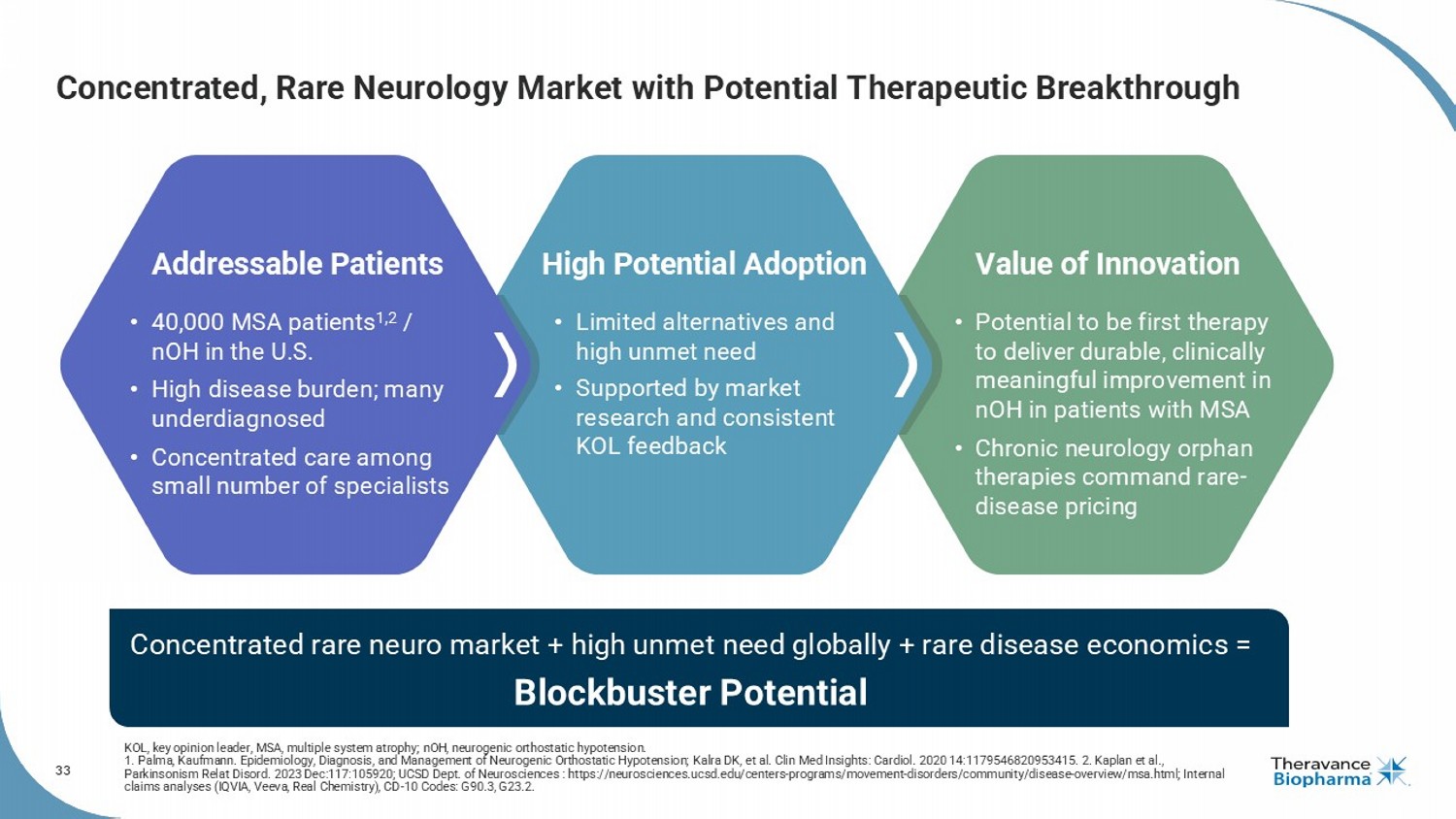 42 Concentrated, Rare Neurology Market with Potential Therapeutic Breakthrough High Potential Adoption Value of Innovation Addressable Patients • Potential to be first therapy to deliver durable, clinically meaningful improvement in nOH in patients with MSA • Chronic neurology orphan therapies command rare - disease pricing • 40,000 MSA patients 1,2 / nOH in the U.S. • High disease burden; many underdiagnosed • Concentrated care among small number of specialists • Limited alternatives and high unmet need • Supported by market research and consistent KOL feedback Concentrated rare neuro market + high unmet need globally + rare disease economics = Blockbuster Potential KOL, key opinion leader, MSA, multiple system atrophy; nOH , neurogenic orthostatic hypotension. 1. Palma, Kaufmann. Epidemiology, Diagnosis, and Management of Neurogenic Orthostatic Hypotension; Kalra DK, et al. Clin Med Insights: Cardiol . 2020 14:1179546820953415 . 2. Kaplan et al., Parkinsonism Relat Disord . 2023 Dec:117:105920; UCSD Dept. of Neurosciences : https://neurosciences.ucsd.edu/centers - programs/movement - disorders/communit y/disease - overview/msa.html; Internal claims analyses (IQVIA, Veeva, Real Chemistry), CD - 10 Codes: G90.3, G23.2.