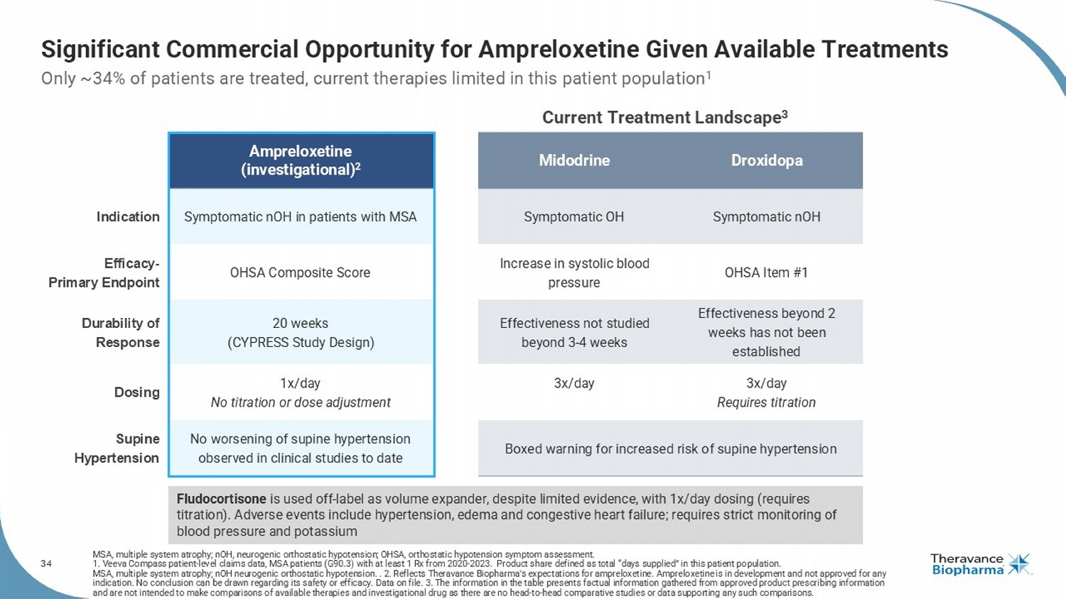 34 Significant Commercial Opportunity for Ampreloxetine Given Available Treatments MSA, multiple system atrophy; nOH , neurogenic orthostatic hypotension; OHSA, orthostatic hypotension symptom assessment. 1. Veeva Compass patient - level claims data, MSA patients (G90.3) with at least 1 Rx from 2020 - 2023. Product share defined as to tal “days supplied” in this patient population. MSA, multiple system atrophy; nOH neurogenic orthostatic hypotension. . 2. Reflects Theravance Biopharma's expectations for ampreloxetine . Ampreloxetine is in development and not approved for any indication. No conclusion can be drawn regarding its safety or efficacy. Data on file. 3. The information in the table presen ts factual information gathered from approved product prescribing information and are not intended to make comparisons of available therapies and investigational drug as there are no head - to - head comparativ e studies or data supporting any such comparisons. Only ~34% of patients are treated, current therapies limited in this patient population 1 Droxidopa Midodrine Ampreloxetine (investigational) 2 Symptomatic nOH Symptomatic OH Symptomatic nOH in patients with MSA Indication OHSA Item #1 Increase in systolic blood pressure OHSA Composite Score Efficacy - Primary Endpoint Effectiveness beyond 2 weeks has not been established Effectiveness not studied beyond 3 - 4 weeks 20 weeks (CYPRESS Study Design) Durability of Response 3x/day Requires titration 3x/day 1x/day No titration or dose adjustment Dosing Boxed warning for increased risk of supine hypertension No worsening of supine hypertension observed in clinical studies to date Supine Hypertension Current Treatment Landscape 3 Fludocortisone is used off - label as volume expander, despite limited evidence, with 1x/day dosing (requires titration). Adverse events include hypertension, edema and congestive heart failure; requires strict monitoring of blood pressure and potassium