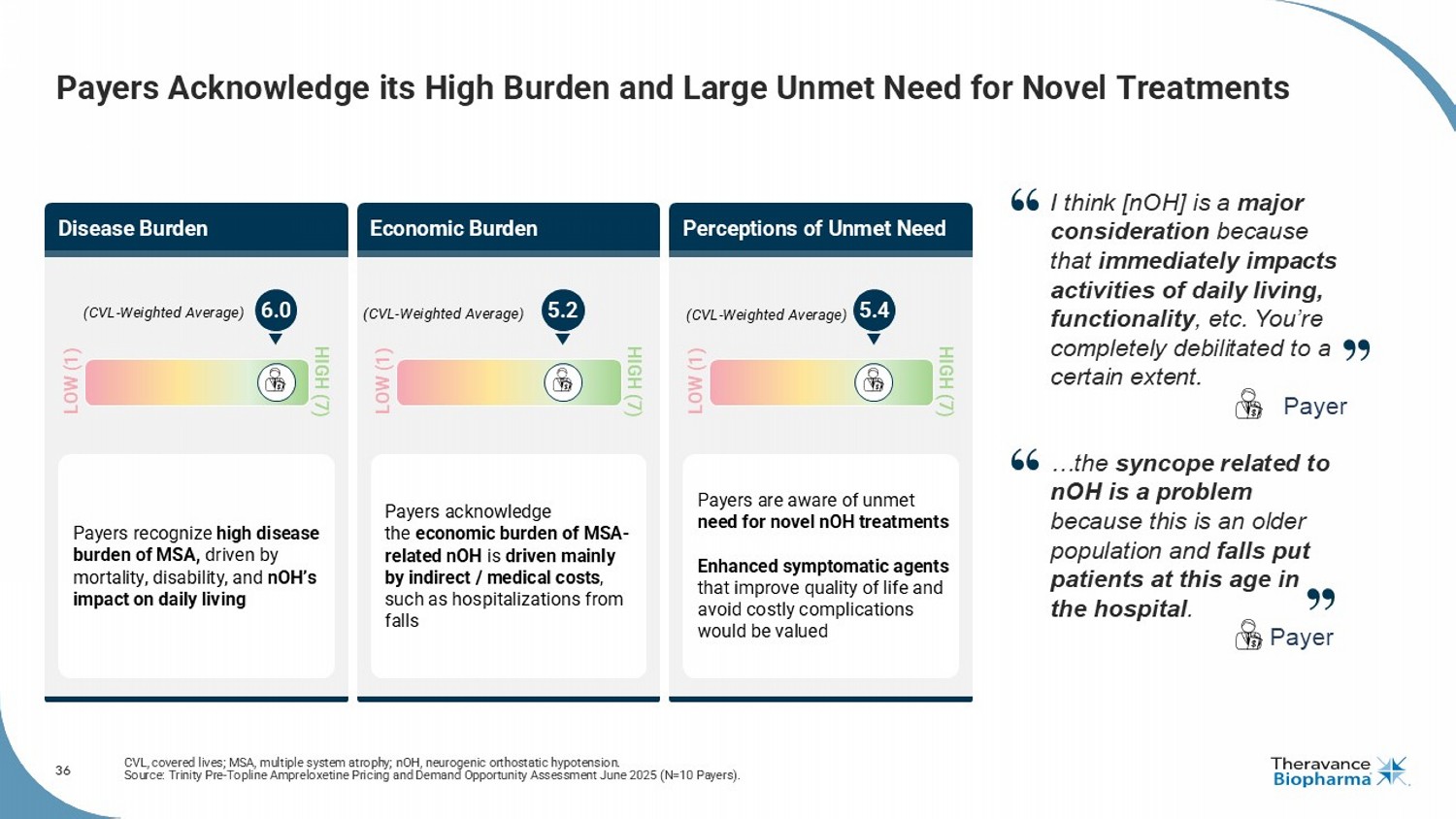 36 Payers Acknowledge its High Burden and Large Unmet Need for Novel Treatments CVL, covered lives; MSA, multiple system atrophy; nOH , neurogenic orthostatic hypotension. Source: Trinity Pre - Topline Ampreloxetine Pricing and Demand Opportunity Assessment June 2025 (N=10 Payers). Disease Burden Perceptions of Unmet Need Economic Burden Payers recognize high disease burden of MSA, driven by mortality, disability, and nOH’s impact on daily living Payers acknowledge the economic burden of MSA - related nOH is driven mainly by indirect / medical costs , such as hospitalizations from falls Payers are aware of unmet need for novel nOH treatments Enhanced symptomatic agents that improve quality of life and avoid costly complications would be valued (CVL - Weighted Average) LOW (1) HIGH (7) (CVL - Weighted Average) LOW (1) HIGH (7) LOW (1) HIGH (7) (CVL - Weighted Average) 6.0 5.2 5.4 I think [ nOH ] is a major consideration because that immediately impacts activities of daily living, functionality , etc. You’re completely debilitated to a certain extent. Payer …the syncope related to nOH is a problem because this is an older population and falls put patients at this age in the hospital . Payer