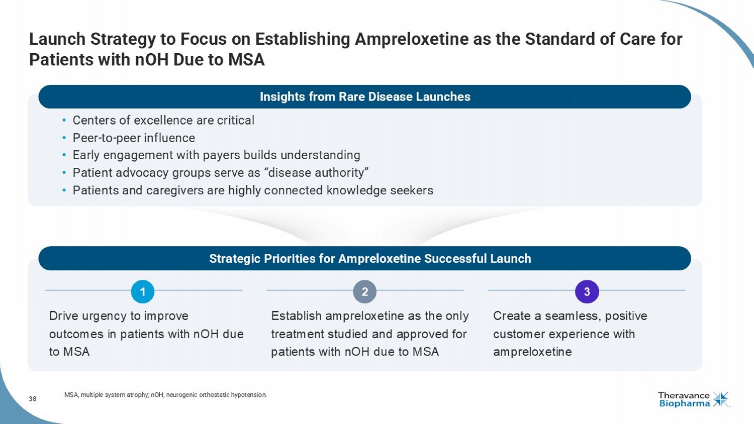 37 ~40,000 Patients with MSA Suffer from Symptomatic nOH in the U.S. MSA is underdiagnosed and often misdiagnosed 1 - 3 ~80% have symptomatic nOH 4,5 ~40K with symptomatic nOH ~50K Patients w/ MSA 6,8,9 Estimated patient population for symptomatic nOH due to MSA in the U.S. Epidemiology supported by detailed claims analysis, substantiated by several leading institutions Claims level analysis supports epidemiology assumptions: • U.S. patient - level claims data using ICD - 10 codes most commonly associated with MSA 6 • Coding practices validated through external experts 7 • S imilar claims - based analysis published in 2023 8 • Leading institutions support estimated epidemiology (e.g., UCSD 9 , NIH) Linking patients to treating specialists: • Initial targeting efforts suggest treating physicians are highly concentrated within autonomic and movement disorder centers, large neurology groups, and select academic institutions • Approach enables efficient deployment of commercial and medical resources across a small, specialized physician universe MSA, multiple system atrophy; nOH, neurogenic orthostatic hypotension. 1. Krismer F, et al. Lancet Neurol. nOH 2024;23(12):1252-1266. 2. DeRight J. Multiple System Atrophy. In: Essential Neuropsychology: A Concise Handbook for Adult Practitioners. Springer; 2021. 3. Goolla M, et al. Frontiers in Neurology. 2023;14:1210220. 4. Palma, Kaufmann. Epidemiology, Diagnosis, and Management of Neurogenic Orthostatic Hypotension. 5. Kalra DK, et al. Clin Med Insights: Cardiol . 2020 14:1179546820953415. 6. Internal claims analyses (IQVIA, Veeva, Real Chemistry); ICD - 10 Codes: G90.3, ~90% of patients, and G23.2, ~10%. 7. Medical coding consultant, as well as primary market res earch with EHR specialists, billing & coding specialists, neurologists, and movement disorder specialists. 8. Estimating the prevalence and incidence of multiple system atrophy in the USA: Insights from a national claims database, Park ins onism and Related Disorders 11/4/2023. 9. UCSD Dept. of Neurosciences (25K - 75K): https://neurosciences.ucsd.edu/centers - programs/movement - disorders/community/disease - overview/msa.html.