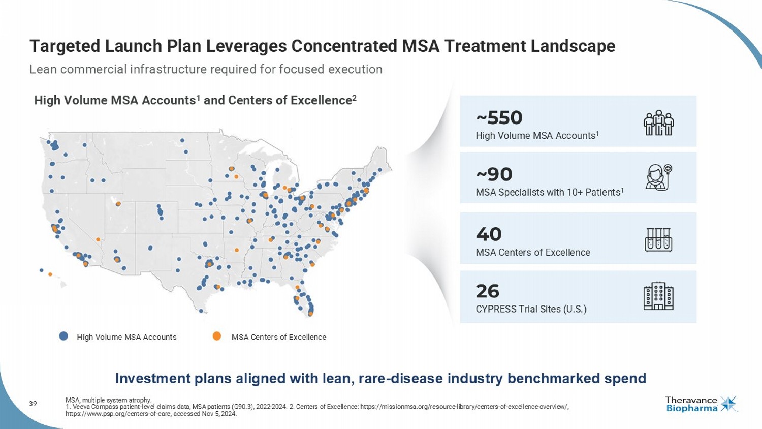 39 Targeted Launch Plan Leverages Concentrated MSA Treatment Landscape MSA, multiple system atrophy. 1. Veeva Compass patient - level claims data, MSA patients (G90.3), 2022 - 2024. 2. Centers of Excellence: https://missionmsa.org/re source - library/centers - of - excellence - overview/, https://www.psp.org/centers - of - care, accessed Nov 5, 2024. 40 MSA Centers of Excellence 26 CYPRESS Trial Sites (U.S.) ~550 High Volume MSA Accounts 1 ~90 MSA Specialists with 10+ Patients 1 Lean commercial infrastructure required for focused execution Investment plans aligned with lean, rare - disease industry benchmarked spend High Volume MSA Accounts 1 and Centers of Excellence 2 High Volume MSA Accounts MSA Centers of Excellence