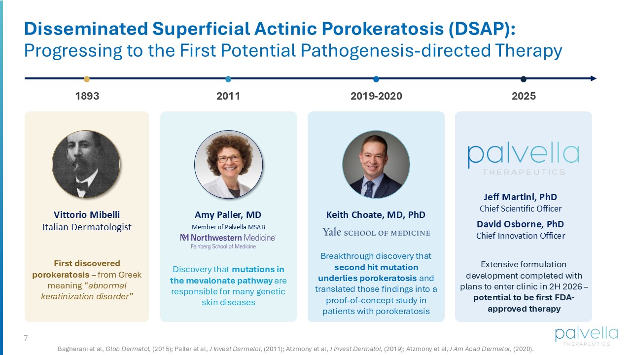 6 Disseminated Superficial Actinic Porokeratosis (DSAP) is a Serious Disease with No FDA - Approved Therapy Keith Choate , MD, PhD High impact to patient quality of life with meaningful risk of malignant transformation to squamous cell carcinomas Image sources: Sim et al, Ann Dermatol, (2018) and Dr. Keith Choate presentation to Palvella (2025). • Aaron B. and Marguerite Lerner Professor and Chair of Dermatology • Professor of Genetics and Pathology • Associate Dean for Physician - Scientist Development • President of the Pediatric Dermatology Research Alliance ( PeDRA ) • Consultant to Palvella