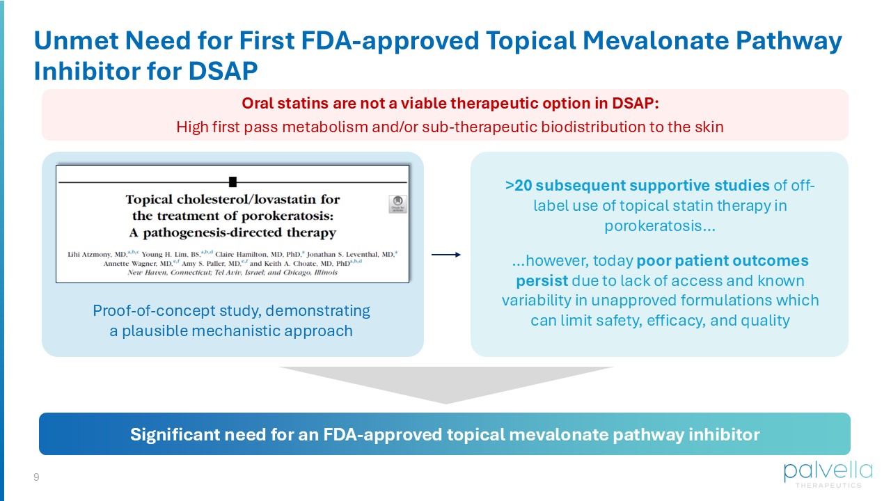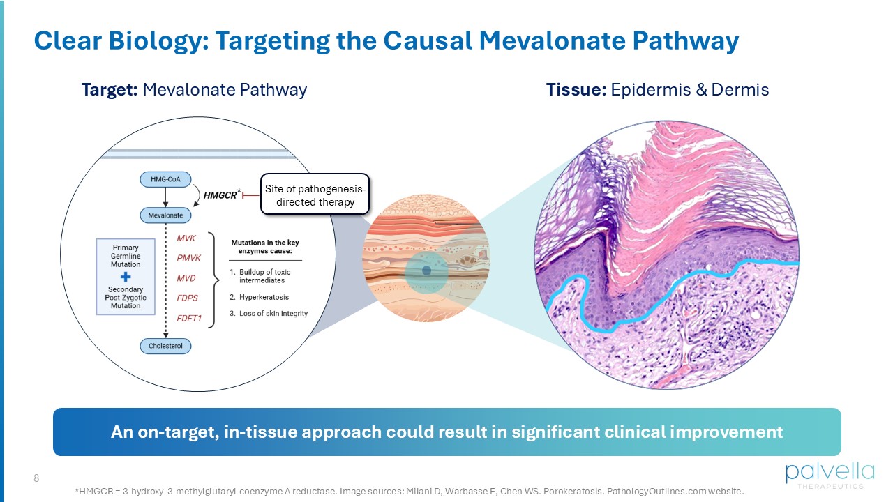 7 Disseminated Superficial Actinic Porokeratosis (DSAP): Progressing to the First Potential Pathogenesis - directed Therapy 2011 Amy Paller, MD Discovery that mutations in the mevalonate pathway are responsible for many genetic skin diseases Member of Palvella MSAB 2019 - 2020 Keith Choate, MD, PhD Breakthrough discovery that second hit mutation underlies porokeratosis and translated those findings into a proof - of - concept study in patients with porokeratosis 2025 Extensive formulation development completed with plans to enter clinic in 2H 2026 – potential to be first FDA - approved therapy Jeff Martini, PhD Chief Scientific Officer David Osborne, PhD Chief Innovation Officer 1893 Vittorio Mibelli Italian Dermatologist First discovered porokeratosis – from Greek meaning “abnormal keratinization disorder” Bagherani et al, Glob Dermatol , (2015); Paller et al, J Invest Dermatol , (2011); Atzmony et al, J Invest Dermatol, (2019); Atzmony et al, J Am Acad Dermatol , (2020).