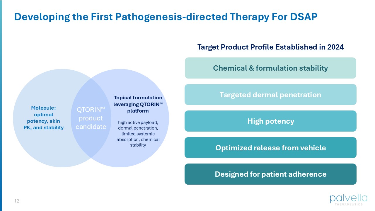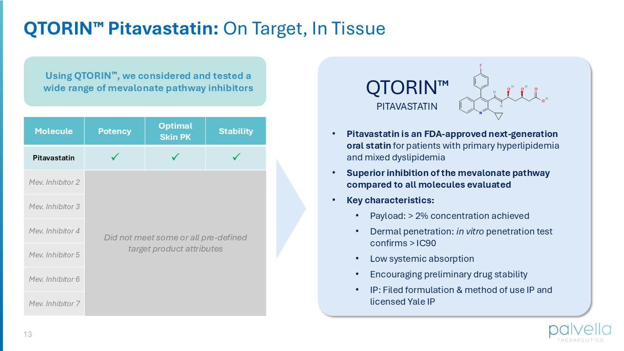12 Developing the First Pathogenesis - directed Therapy For DSAP Molecule: optimal potency, skin PK, and stability Topical formulation leveraging QTORIN platform high active payload, dermal penetration, limited systemic absorption, chemical stability QTORIN product candidate Targeted dermal penetration Chemical & formulation stability Optimized release from vehicle High potency Designed for patient adherence Target Product Profile Established in 2024