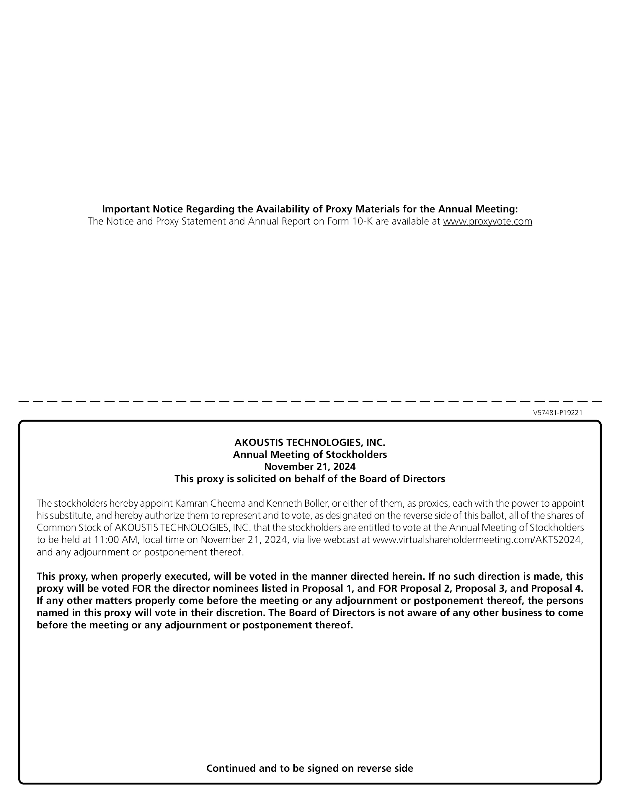 Important Notice Regarding the Availability of Proxy Materials for the Annual Meeting: The Notice and Proxy Statement and Annual Report on Form 10-K are available at www.proxyvote.com V57481-P19221 AKOUSTIS TECHNOLOGIES, INC. Annual Meeting of Stockholders November 21, 2024 This proxy is solicited on behalf of the Board of Directors The stockholders hereby appoint Kamran Cheema and Kenneth Boller, or either of them, as proxies, each with the power to appoint his substitute, and hereby authorize them to represent and to vote, as designated on the reverse side of this ballot, all of the shares of Common Stock of AKOUSTIS TECHNOLOGIES, INC. that the stockholders are entitled to vote at the Annual Meeting of Stockholders to be held at 11:00 AM, local time on November 21, 2024, via live webcast at www.virtualshareholdermeeting.com/AKTS2024, and any adjournment or postponement thereof. This proxy, when properly executed, will be voted in the manner directed herein. If no such direction is made, this proxy will be voted FOR the director nominees listed in Proposal 1, and FOR Proposal 2, Proposal 3, and Proposal 4. If any other matters properly come before the meeting or any adjournment or postponement thereof, the persons named in this proxy will vote in their discretion. The Board of Directors is not aware of any other business to come before the meeting or any adjournment or postponement thereof. Continued and to be signed on reverse side