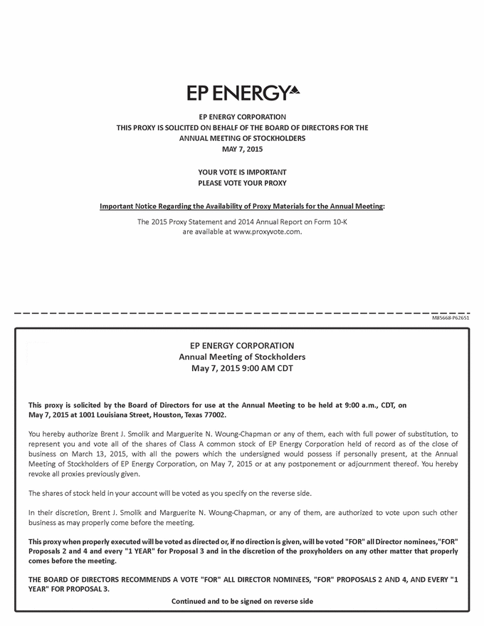 EP ENERGY CORPORATION THIS PROXY IS SOLICITED ON BEHALF OF THE BOARD OF DIRECTORS FOR THE ANNUAL MEETING OF STOCKHOLDERS MAY 7, 2015 YOUR VOTE IS IMPORTANT PLEASE VOTE YOUR PROXY Important Notice Regarding the Availability of Proxy Materials for the Annual Meeting: The 2015 Proxy Statement and 2014 Annual Report on Form 10-K are available at www.proxyvote.com. M85668-P62651 EP ENERGY CORPORATION Annual Meeting of Stockholders May 7, 2015 9:00 AM CDT This proxy is solicited by the Board of Directors for use at the Annual Meeting to be held at 9:00 a.m., CDT, on May 7, 2015 at 1001 Louisiana Street, Houston, Texas 77002. You hereby authorize Brent J. Smolik and Marguerite N. Woung-Chapman or any of them, each with full power of substitution, to represent you and vote all of the shares of Class A common stock of EP Energy Corporation held of record as of the close of business on March 13, 2015, with all the powers which the undersigned would possess if personally present, at the Annual Meeting of Stockholders of EP Energy Corporation, on May 7, 2015 or at any postponement or adjournment thereof. You hereby revoke all proxies previously given. The shares of stock held in your account will be voted as you specify on the reverse side. In their discretion, Brent J. Smolik and Marguerite N. Woung-Chapman, or any of them, are authorized to vote upon such other business as may properly come before the meeting. This proxy when properly executed will be voted as directed or, if no direction is given, will be voted "FOR" all Director nominees,"FOR" Proposals 2 and 4 and every "1 YEAR" for Proposal 3 and in the discretion of the proxyholders on any other matter that properly comes before the meeting. THE BOARD OF DIRECTORS RECOMMENDS A VOTE "FOR" ALL DIRECTOR NOMINEES, "FOR" PROPOSALS 2 AND 4, AND EVERY "1 YEAR" FOR PROPOSAL 3. Continued and to be signed on reverse side |
