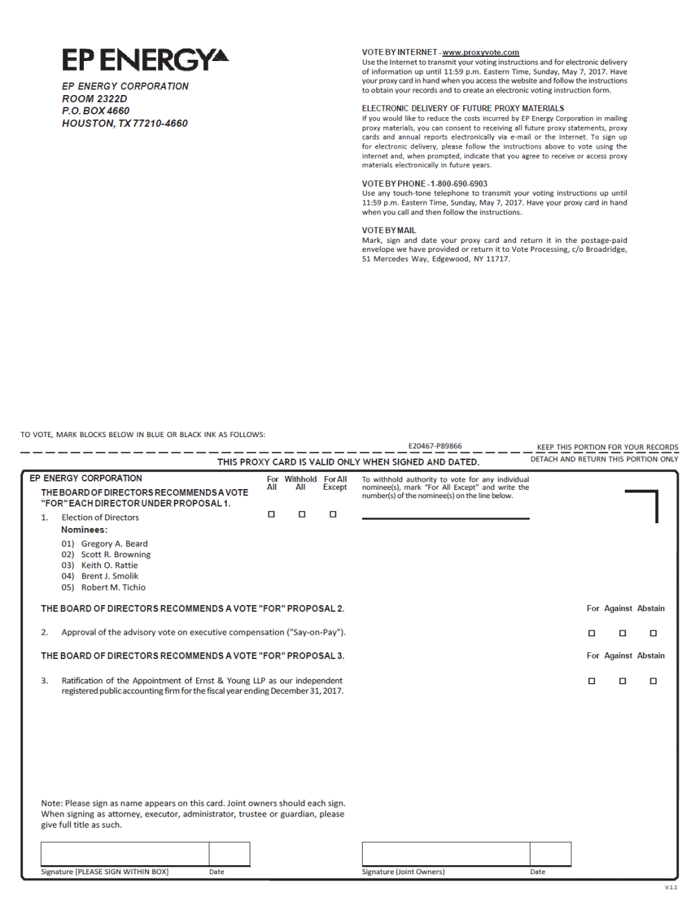 VOTE BY INTERNET - www.proxyvote.com Use the Internet to transmit your voting instructions and for electronic delivery of information up until 11:59 p.m. Eastern Time, Sunday, May 7, 2017. Have your proxy card in hand when you access the website and follow the instructions to obtain your records and to create an electronic voting instruction form. EP ENERGY CORPORATION ROOM 2322D P.O. BOX 4660 HOUSTON, TX 77210-4660 ELECTRONIC DELIVERY OF FUTURE PROXY MATERIALS If you would like to reduce the costs incurred by EP Energy Corporation in mailing proxy materials, you can consent to receiving all future proxy statements, proxy cards and annual reports electronically via e-mail or the Internet. To sign up for electronic delivery, please follow the instructions above to vote using the Internet and, when prompted, indicate that you agree to receive or access proxy materials electronically in future years. VOTE BY PHONE - 1-800-690-6903 Use any touch-tone telephone to transmit your voting instructions up until 11:59 p.m. Eastern Time, Sunday, May 7, 2017. Have your proxy card in hand when you call and then follow the instructions. VOTE BY MAIL Mark, sign and date your proxy card and return it in the postage-paid envelope we have provided or return it to Vote Processing, c/o Broadridge, 51 Mercedes Way, Edgewood, NY 11717. TO VOTE, MARK BLOCKS BELOW IN BLUE OR BLACK INK AS FOLLOWS: E20467-P89866 KEEP THIS PORTION FOR YOUR RECORDS DETACH AND RETURN THIS PORTION ONLY THIS PROXY CARD IS VALID ONLY WHEN SIGNED AND DATED. EP ENERGY CORPORATION THE BOARD OF DIRECTORS RECOMMENDS A VOTE "FOR" EACH DIRECTOR UNDER PROPOSAL 1. 1. Election of Directors Nominees: For Withhold AllAll For All Except To withhold authority to vote for any individual nominee(s), mark “For All Except” and write the number(s) of the nominee(s) on the line below. 01) 02) 03) 04) 05) Gregory A. Beard Scott R. Browning Keith O. Rattie Brent J. Smolik Robert M. Tichio THE BOARD OF DIRECTORS RECOMMENDS A VOTE "FOR" PROPOSAL 2. For Against Abstain 2. Approval of the advisory vote on executive compensation ("Say-on-Pay"). THE BOARD OF DIRECTORS RECOMMENDS A VOTE "FOR" PROPOSAL 3. For Against Abstain 3. Ratification of the Appointment of Ernst & Young LLP as our independent registered public accounting firm for the fiscal year ending December 31, 2017. Note: Please sign as name appears on this card. Joint owners should each sign. When signing as attorney, executor, administrator, trustee or guardian, please give full title as such. Signature [PLEASE SIGN WITHIN BOX] Date Signature (Joint Owners) Date V.1.1