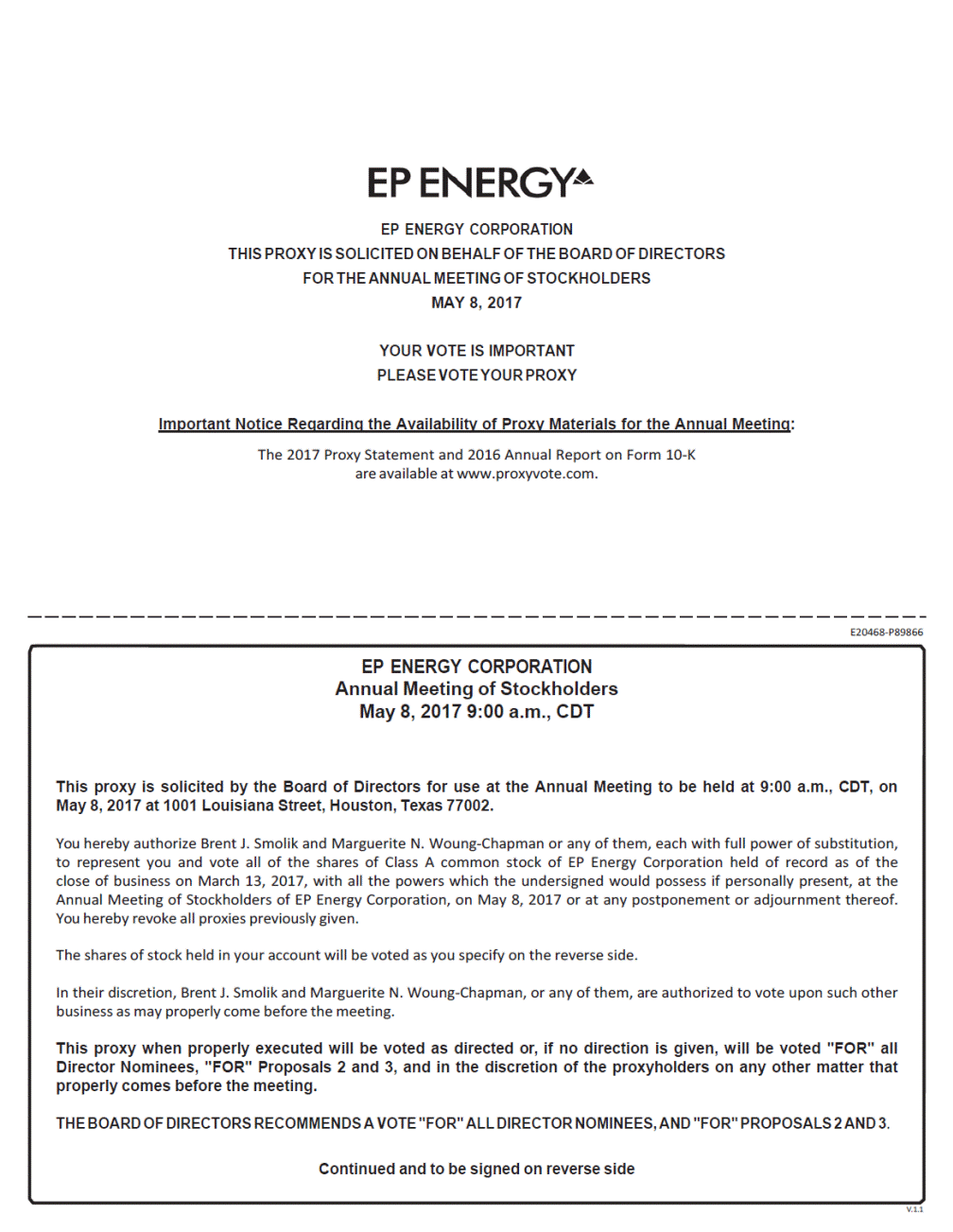 EP ENERGY CORPORATION THIS PROXY IS SOLICITED ON BEHALF OF THE BOARD OF DIRECTORS FOR THE ANNUAL MEETING OF STOCKHOLDERS MAY 8, 2017 YOUR VOTE IS IMPORTANT PLEASE VOTE YOUR PROXY Important Notice Regarding the Availability of Proxy Materials for the Annual Meeting: The 2017 Proxy Statement and 2016 Annual Report on Form 10-K are available at www.proxyvote.com. E20468-P89866 EP ENERGY CORPORATION Annual Meeting of Stockholders May 8, 2017 9:00 a.m., CDT This proxy is solicited by the Board of Directors for use at the Annual Meeting to be held at 9:00 a.m., CDT, on May 8, 2017 at 1001 Louisiana Street, Houston, Texas 77002. You hereby authorize Brent J. Smolik and Marguerite N. Woung-Chapman or any of them, each with full power of substitution, to represent you and vote all of the shares of Class A common stock of EP Energy Corporation held of record as of the close of business on March 13, 2017, with all the powers which the undersigned would possess if personally present, at the Annual Meeting of Stockholders of EP Energy Corporation, on May 8, 2017 or at any postponement or adjournment thereof. You hereby revoke all proxies previously given. The shares of stock held in your account will be voted as you specify on the reverse side. In their discretion, Brent J. Smolik and Marguerite N. Woung-Chapman, or any of them, are authorized to vote upon such other business as may properly come before the meeting. This proxy when properly executed will be voted as directed or, if no direction is given, will be voted "FOR" all Director Nominees, "FOR" Proposals 2 and 3, and in the discretion of the proxyholders on any other matter that properly comes before the meeting. THE BOARD OF DIRECTORS RECOMMENDS A VOTE "FOR" ALL DIRECTOR NOMINEES, AND "FOR" PROPOSALS 2 AND 3. Continued and to be signed on reverse side V.1.1