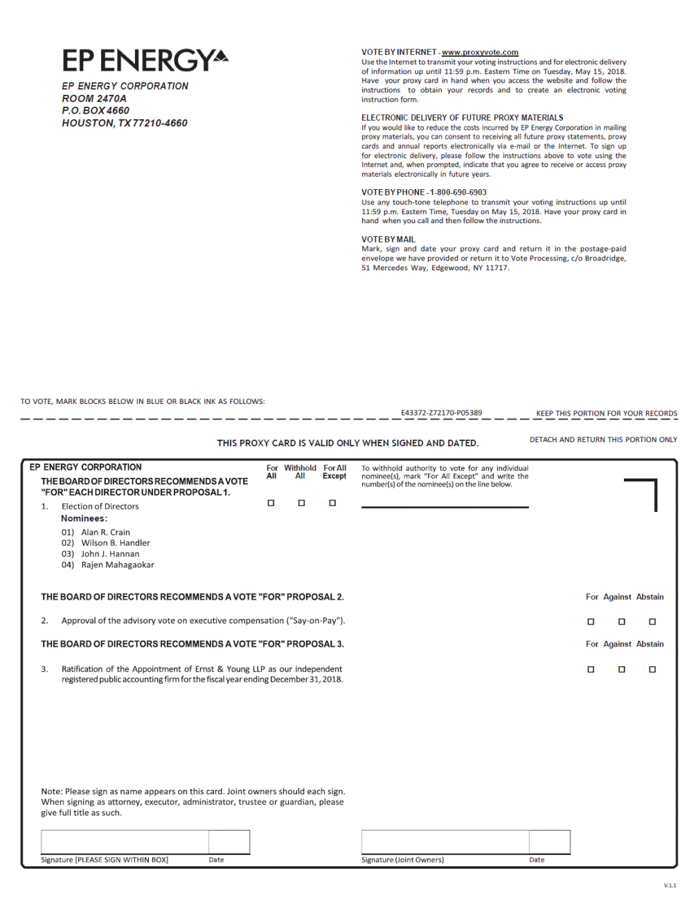 VOTE BY INTERNET - www.proxyvote.com Use the Internet to transmit your voting instructions and for electronic delivery of information up until 11:59 p.m. Eastern Time on Tuesday, May 15, 2018. Have your proxy card in hand when you access the website and follow the instructions to obtain your records and to create an electronic voting instruction form. EP ENERGY CORPORATION ROOM 2470A P.O. BOX 4660 HOUSTON, TX 77210-4660 ELECTRONIC DELIVERY OF FUTURE PROXY MATERIALS If you would like to reduce the costs incurred by EP Energy Corporation in mailing proxy materials, you can consent to receiving all future proxy statements, proxy cards and annual reports electronically via e-mail or the Internet. To sign up for electronic delivery, please follow the instructions above to vote using the Internet and, when prompted, indicate that you agree to receive or access proxy materials electronically in future years. VOTE BY PHONE - 1-800-690-6903 Use any touch-tone telephone to transmit your voting instructions up until 11:59 p.m. Eastern Time, Tuesday on May 15, 2018. Have your proxy card in hand when you call and then follow the instructions. VOTE BY MAIL Mark, sign and date your proxy card and return it in the postage-paid envelope we have provided or return it to Vote Processing, c/o Broadridge, 51 Mercedes Way, Edgewood, NY 11717. TO VOTE, MARK BLOCKS BELOW IN BLUE OR BLACK INK AS FOLLOWS: E43372-Z72170-P05389 KEEP THIS PORTION FOR YOUR RECORDS DETACH AND RETURN THIS PORTION ONLY THIS PROXY CARD IS VALID ONLY WHEN SIGNED AND DATED. For Withhold All For All Nominees: For Against Abstain For Against Abstain Date Date V.1.1