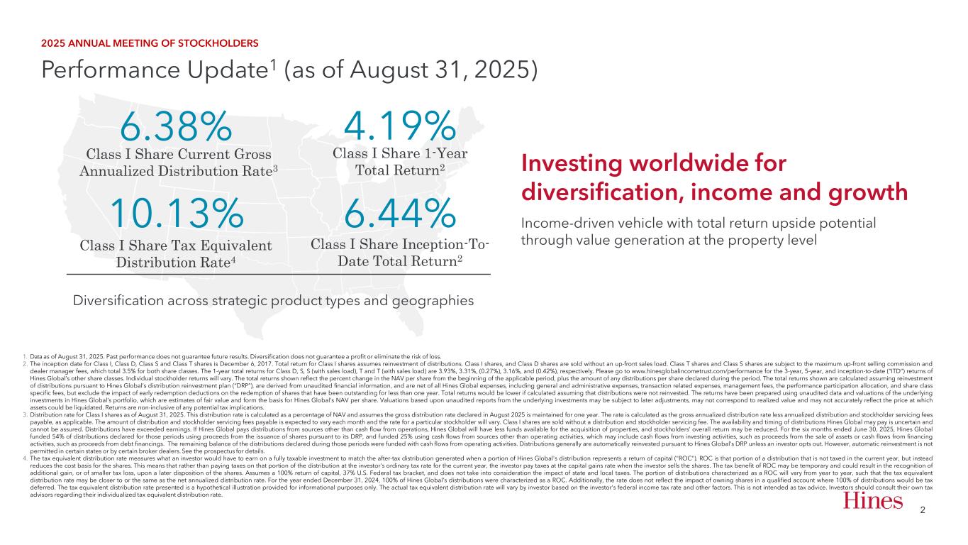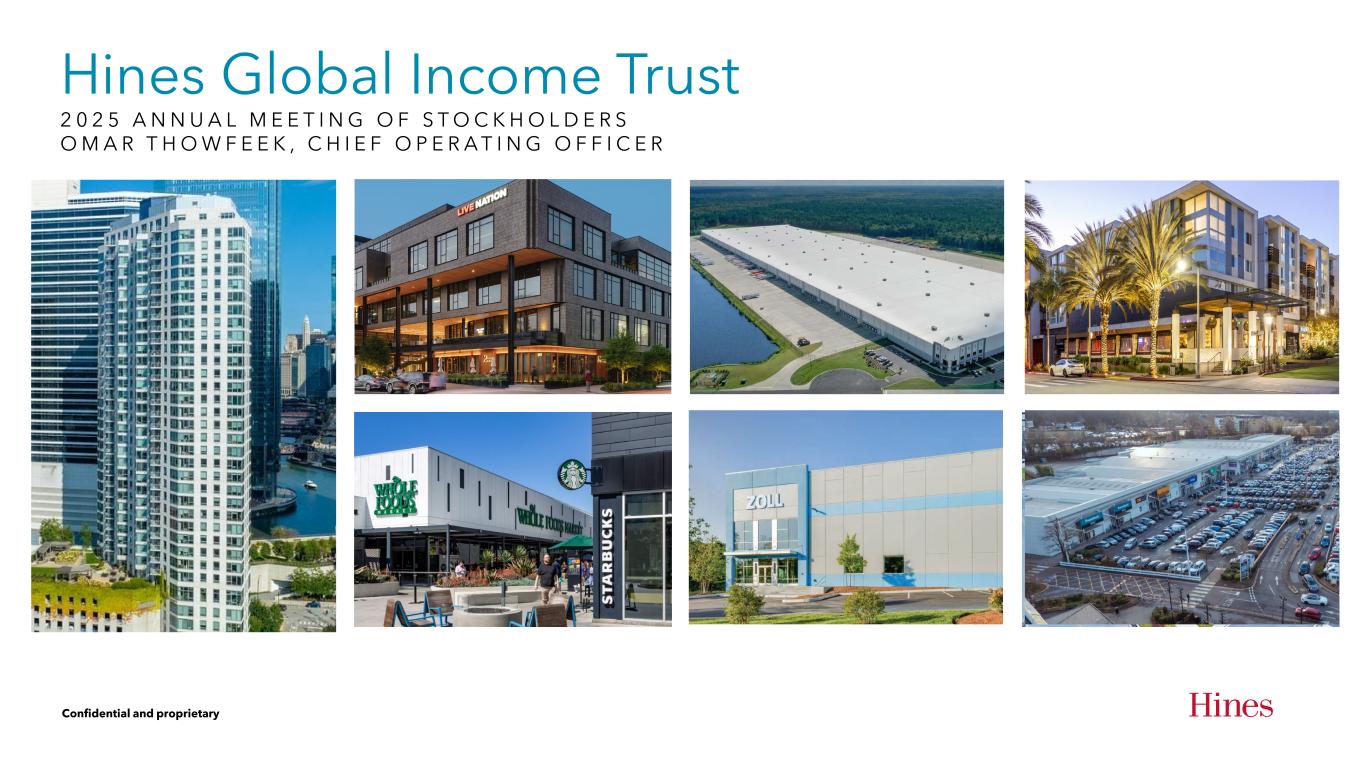 2025 ANNUAL MEETING OF STOCKHOLDERS Performance Update1 (as of August 31, 2025) 2 Diversification across strategic product types and geographies Investing worldwide for diversification, income and growth Income-driven vehicle with total return upside potential through value generation at the property levelClass I Share Tax Equivalent Distribution Rate4 Class I Share Current Gross Annualized Distribution Rate3 6.38% 10.13% Class I Share Inception-To- Date Total Return2 4.19% 6.44% Class I Share 1-Year Total Return2 1. Data as of August 31, 2025. Past performance does not guarantee future results. Diversification does not guarantee a profit or eliminate the risk of loss. 2. The inception date for Class I, Class D, Class S and Class T shares is December 6, 2017. Total return for Class I shares assumes reinvestment of distributions. Class I shares, and Class D shares are sold without an up-front sales load. Class T shares and Class S shares are subject to the maximum up-front selling commission and dealer manager fees, which total 3.5% for both share classes. The 1-year total returns for Class D, S, S (with sales load), T and T (with sales load) are 3.93%, 3.31%, (0.27%), 3.16%, and (0.42%), respectively. Please go to www.hinesglobalincometrust.com/performance for the 3-year, 5-year, and inception-to-date (“ITD”) returns of Hines Global’s other share classes. Individual stockholder returns will vary. The total returns shown reflect the percent change in the NAV per share from the beginning of the applicable period, plus the amount of any distributions per share declared during the period. The total returns shown are calculated assuming reinvestment of distributions pursuant to Hines Global’s distribution reinvestment plan (“DRP”), are derived from unaudited financial information, and are net of all Hines Global expenses, including general and administrative expenses, transaction related expenses, management fees, the performance participation allocation, and share class specific fees, but exclude the impact of early redemption deductions on the redemption of shares that have been outstanding for less than one year. Total returns would be lower if calculated assuming that distributions were not reinvested. The returns have been prepared using unaudited data and valuations of the underlying investments in Hines Global’s portfolio, which are estimates of fair value and form the basis for Hines Global’s NAV per share. Valuations based upon unaudited reports from the underlying investments may be subject to later adjustments, may not correspond to realized value and may not accurately reflect the price at which assets could be liquidated. Returns are non-inclusive of any potential tax implications. 3. Distribution rate for Class I shares as of August 31, 2025. This distribution rate is calculated as a percentage of NAV and assumes the gross distribution rate declared in August 2025 is maintained for one year. The rate is calculated as the gross annualized distribution rate less annualized distribution and stockholder servicing fees payable, as applicable. The amount of distribution and stockholder servicing fees payable is expected to vary each month and the rate for a particular stockholder will vary. Class I shares are sold without a distribution and stockholder servicing fee. The availability and timing of distributions Hines Global may pay is uncertain and cannot be assured. Distributions have exceeded earnings. If Hines Global pays distributions from sources other than cash flow from operations, Hines Global will have less funds available for the acquisition of properties, and stockholders’ overall return may be reduced. For the six months ended June 30, 2025, Hines Global funded 54% of distributions declared for those periods using proceeds from the issuance of shares pursuant to its DRP, and funded 25% using cash flows from sources other than operating activities, which may include cash flows from investing activities, such as proceeds from the sale of assets or cash flows from financing activities, such as proceeds from debt financings. The remaining balance of the distributions declared during those periods were funded with cash flows from operating activities. Distributions generally are automatically reinvested pursuant to Hines Global’s DRP unless an investor opts out. However, automatic reinvestment is not permitted in certain states or by certain broker dealers. See the prospectus for details. 4. The tax equivalent distribution rate measures what an investor would have to earn on a fully taxable investment to match the after-tax distribution generated when a portion of Hines Global's distribution represents a return of capital ("ROC"). ROC is that portion of a distribution that is not taxed in the current year, but instead reduces the cost basis for the shares. This means that rather than paying taxes on that portion of the distribution at the investor's ordinary tax rate for the current year, the investor pay taxes at the capital gains rate when the investor sells the shares. The tax benefit of ROC may be temporary and could result in the recognition of additional gain, or of smaller tax loss, upon a later disposition of the shares. Assumes a 100% return of capital, 37% U.S. Federal tax bracket, and does not take into consideration the impact of state and local taxes. The portion of distributions characterized as a ROC will vary from year to year, such that the tax equivalent distribution rate may be closer to or the same as the net annualized distribution rate. For the year ended December 31, 2024, 100% of Hines Global's distributions were characterized as a ROC. Additionally, the rate does not reflect the impact of owning shares in a qualified account where 100% of distributions would be tax deferred. The tax equivalent distribution rate presented is a hypothetical illustration provided for informational purposes only. The actual tax equivalent distribution ra