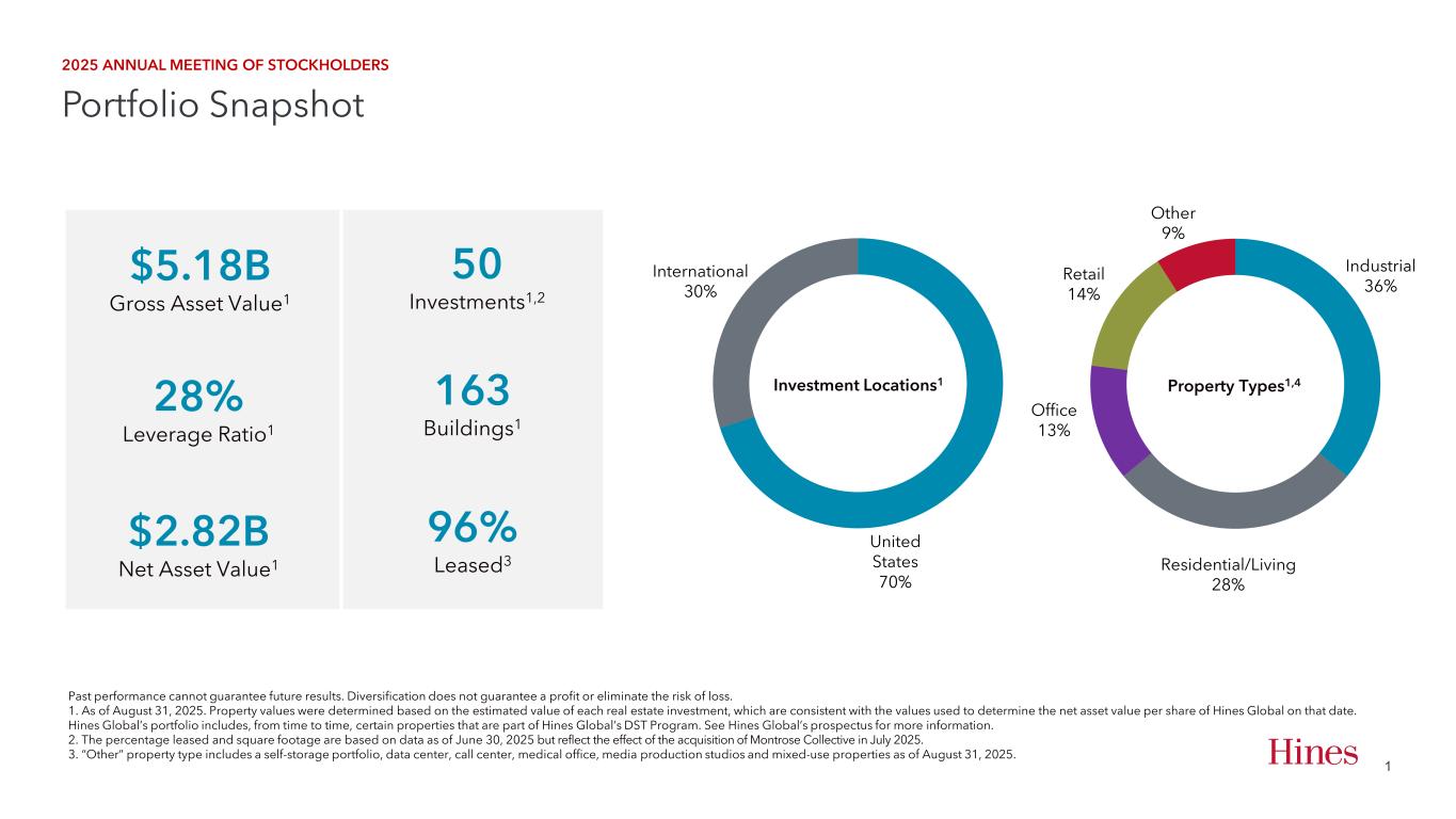 $5.18B Gross Asset Value1 28% Leverage Ratio1 $2.82B Net Asset Value1 50 Investments1,2 163 Buildings1 96% Leased3 2025 ANNUAL MEETING OF STOCKHOLDERS Portfolio Snapshot United States 70% International 30% Investment Locations1 Industrial 36% Residential/Living 28% Office 13% Retail 14% Other 9% Property Types1,4 1 Past performance cannot guarantee future results. Diversification does not guarantee a profit or eliminate the risk of loss. 1. As of August 31, 2025. Property values were determined based on the estimated value of each real estate investment, which are consistent with the values used to determine the net asset value per share of Hines Global on that date. Hines Global’s portfolio includes, from time to time, certain properties that are part of Hines Global’s DST Program. See Hines Global’s prospectus for more information. 2. The percentage leased and square footage are based on data as of June 30, 2025 but reflect the effect of the acquisition of Montrose Collective in July 2025. 3. “Other” property type includes a self-storage portfolio, data center, call center, medical office, media production studios and mixed-use properties as of August 31, 2025.