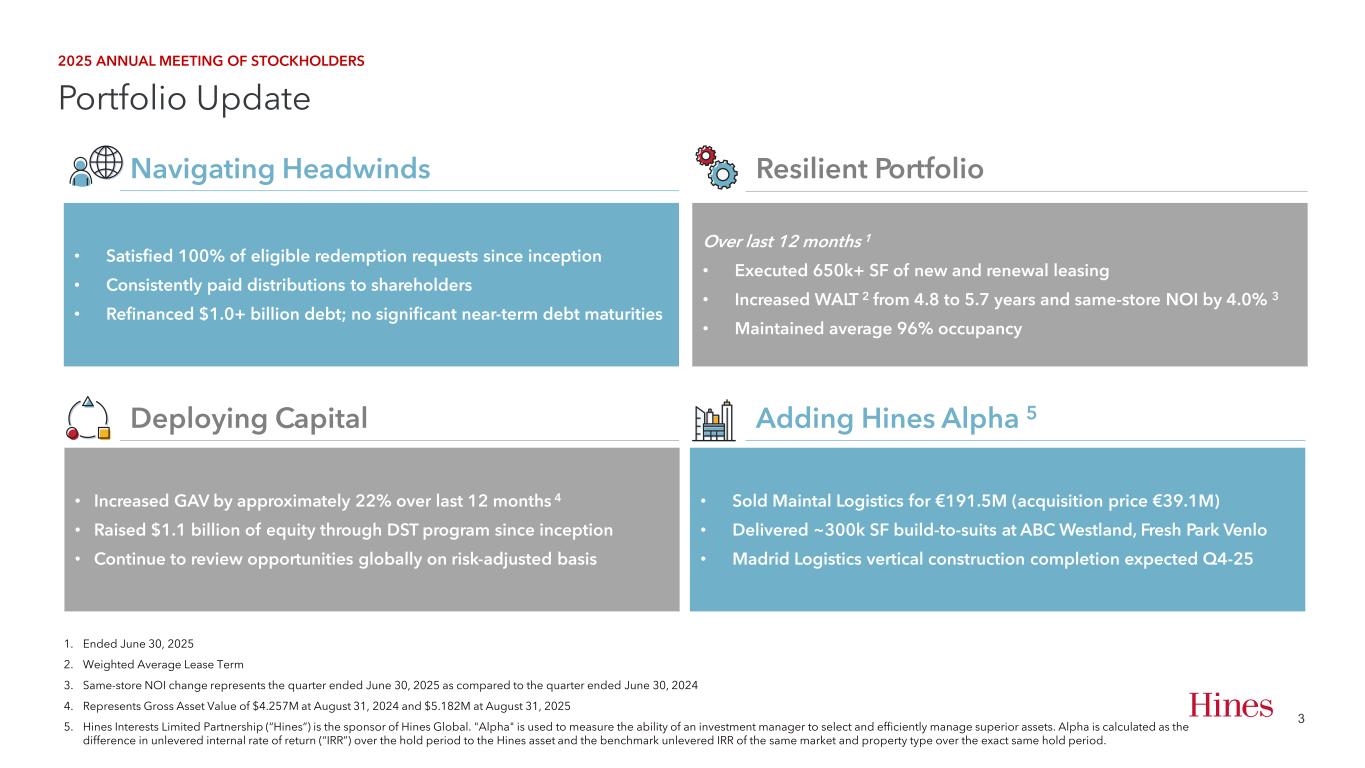 2025 ANNUAL MEETING OF STOCKHOLDERS Portfolio Update 3 • Increased GAV by approximately 22% over last 12 months 4 • Raised $1.1 billion of equity through DST program since inception • Continue to review opportunities globally on risk-adjusted basis • Satisfied 100% of eligible redemption requests since inception • Consistently paid distributions to shareholders • Refinanced $1.0+ billion debt; no significant near-term debt maturities Over last 12 months 1 • Executed 650k+ SF of new and renewal leasing • Increased WALT 2 from 4.8 to 5.7 years and same-store NOI by 4.0% 3 • Maintained average 96% occupancy • Sold Maintal Logistics for €191.5M (acquisition price €39.1M) • Delivered ~300k SF build-to-suits at ABC Westland, Fresh Park Venlo • Madrid Logistics vertical construction completion expected Q4-25 Navigating Headwinds Resilient Portfolio Deploying Capital Adding Hines Alpha 5 1. Ended June 30, 2025 2. Weighted Average Lease Term 3. Same-store NOI change represents the quarter ended June 30, 2025 as compared to the quarter ended June 30, 2024 4. Represents Gross Asset Value of $4.257M at August 31, 2024 and $5.182M at August 31, 2025 5. Hines Interests Limited Partnership (“Hines”) is the sponsor of Hines Global. "Alpha" is used to measure the ability of an investment manager to select and efficiently manage superior assets. Alpha is calculated as the difference in unlevered internal rate of return (“IRR”) over the hold period to the Hines asset and the benchmark unlevered IRR of the same market and property type over the exact same hold period.