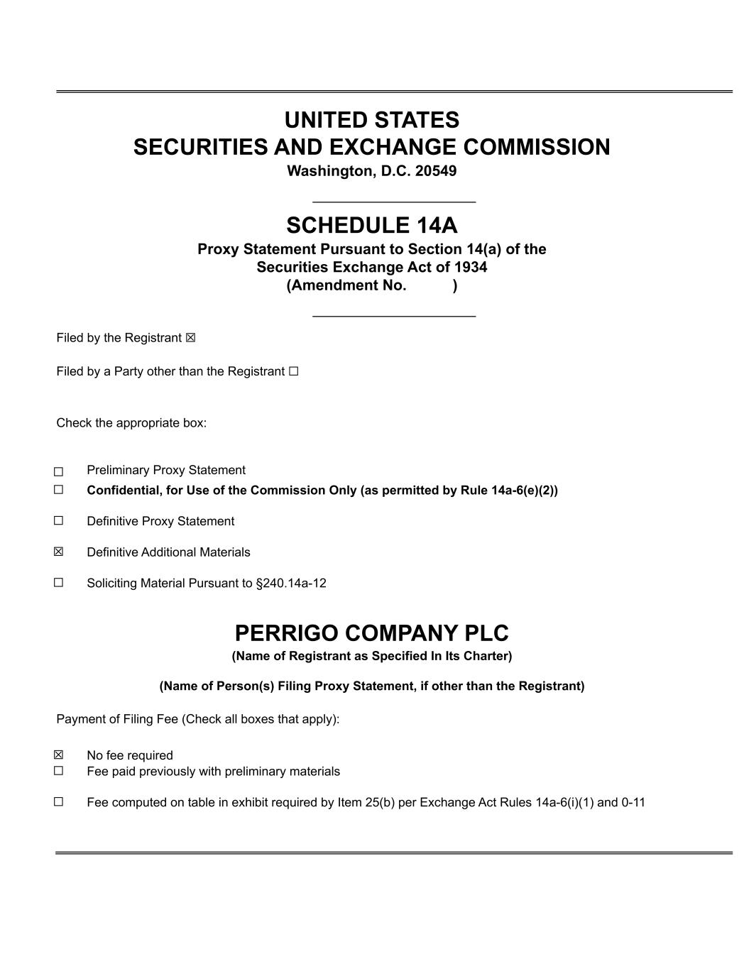 UNITED STATES SECURITIES AND EXCHANGE COMMISSION Washington, D.C. 20549 SCHEDULE 14A Proxy Statement Pursuant to Section 14(a) of the Securities Exchange Act of 1934 (Amendment No. ) Filed by the Registrant ☒ Filed by a Party other than the Registrant ☐ Check the appropriate box: ☐ Preliminary Proxy Statement ☐ Confidential, for Use of the Commission Only (as permitted by Rule 14a-6(e)(2)) ☐ Definitive Proxy Statement ☒ Definitive Additional Materials ☐ Soliciting Material Pursuant to §240.14a-12 PERRIGO COMPANY PLC (Name of Registrant as Specified In Its Charter) (Name of Person(s) Filing Proxy Statement, if other than the Registrant) Payment of Filing Fee (Check all boxes that apply): ☒ No fee required ☐ Fee paid previously with preliminary materials ☐ Fee computed on table in exhibit required by Item 25(b) per Exchange Act Rules 14a-6(i)(1) and 0-11