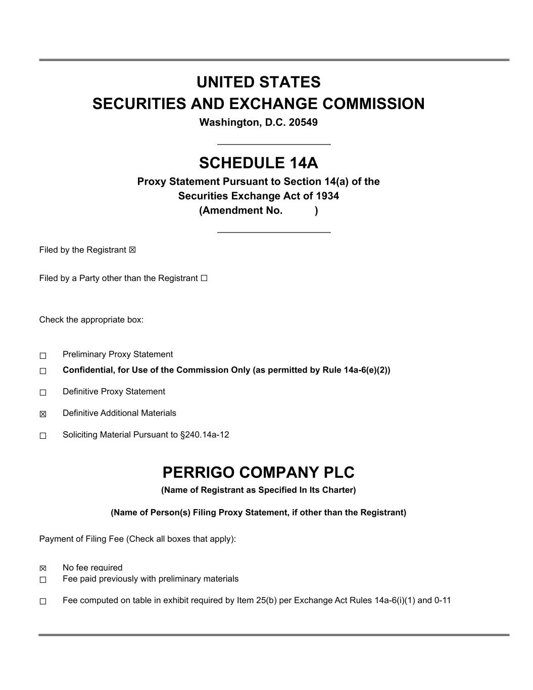UNITED STATES SECURITIES AND EXCHANGE COMMISSION Washington, D.C. 20549 SCHEDULE 14A Proxy Statement Pursuant to Section 14(a) of the Securities Exchange Act of 1934 (Amendment No. ) Filed by the Registrant ☒ Filed by a Party other than the Registrant ☐ Check the appropriate box: ☐ Preliminary Proxy Statement ☐ Confidential, for Use of the Commission Only (as permitted by Rule 14a-6(e)(2)) ☐ Definitive Proxy Statement ☒ Definitive Additional Materials ☐ Soliciting Material Pursuant to §240.14a-12 PERRIGO COMPANY PLC (Name of Registrant as Specified In Its Charter) (Name of Person(s) Filing Proxy Statement, if other than the Registrant) Payment of Filing Fee (Check all boxes that apply): ☒ No fee required ☐ Fee paid previously with preliminary materials ☐ Fee computed on table in exhibit required by Item 25(b) per Exchange Act Rules 14a-6(i)(1) and 0-11