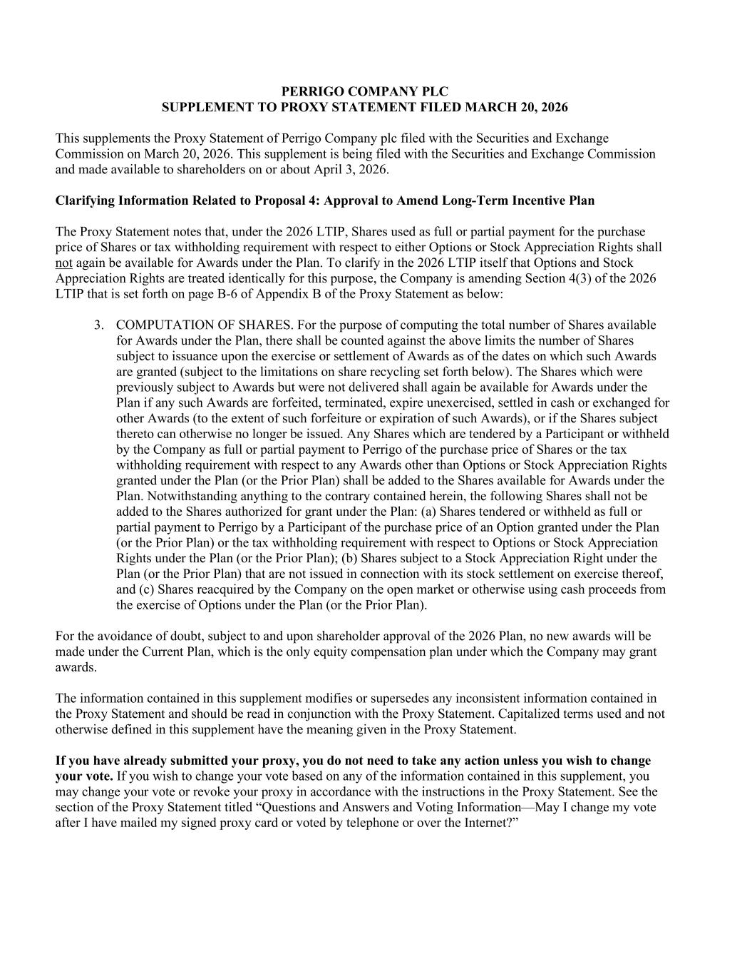 PERRIGO COMPANY PLC SUPPLEMENT TO PROXY STATEMENT FILED MARCH 20, 2026 This supplements the Proxy Statement of Perrigo Company plc filed with the Securities and Exchange Commission on March 20, 2026. This supplement is being filed with the Securities and Exchange Commission and made available to shareholders on or about April 3, 2026. Clarifying Information Related to Proposal 4: Approval to Amend Long-Term Incentive Plan The Proxy Statement notes that, under the 2026 LTIP, Shares used as full or partial payment for the purchase price of Shares or tax withholding requirement with respect to either Options or Stock Appreciation Rights shall not again be available for Awards under the Plan. To clarify in the 2026 LTIP itself that Options and Stock Appreciation Rights are treated identically for this purpose, the Company is amending Section 4(3) of the 2026 LTIP that is set forth on page B-6 of Appendix B of the Proxy Statement as below: 3. COMPUTATION OF SHARES. For the purpose of computing the total number of Shares available for Awards under the Plan, there shall be counted against the above limits the number of Shares subject to issuance upon the exercise or settlement of Awards as of the dates on which such Awards are granted (subject to the limitations on share recycling set forth below). The Shares which were previously subject to Awards but were not delivered shall again be available for Awards under the Plan if any such Awards are forfeited, terminated, expire unexercised, settled in cash or exchanged for other Awards (to the extent of such forfeiture or expiration of such Awards), or if the Shares subject thereto can otherwise no longer be issued. Any Shares which are tendered by a Participant or withheld by the Company as full or partial payment to Perrigo of the purchase price of Shares or the tax withholding requirement with respect to any Awards other than Options or Stock Appreciation Rights granted under the Plan (or the Prior Plan) shall be added to the Shares available for Awards under the Plan. Notwithstanding anything to the contrary contained herein, the following Shares shall not be added to the Shares authorized for grant under the Plan: (a) Shares tendered or withheld as full or partial payment to Perrigo by a Participant of the purchase price of an Option granted under the Plan (or the Prior Plan) or the tax withholding requirement with respect to Options or Stock Appreciation Rights under the Plan (or the Prior Plan); (b) Shares subject to a Stock Appreciation Right under the Plan (or the Prior Plan) that are not issued in connection with its stock settlement on exercise thereof, and (c) Shares reacquired by the Company on the open market or otherwise using cash proceeds from the exercise of Options under the Plan (or the Prior Plan). For the avoidance of doubt, subject to and upon shareholder approval of the 2026 Plan, no new awards will be made under the Current Plan, which is the only equity compensation plan under which the Company may grant awards. The information contained in this supplement modifies or supersedes any inconsistent information contained in the Proxy Statement and should be read in conjunction with the Proxy Statement. Capitalized terms used and not otherwise defined in this supplement have the meaning given in the Proxy Statement. If you have already submitted your proxy, you do not need to take any action unless you wish to change your vote. If you wish to change your vote based on any of the information contained in this supplement, you may change your vote or revoke your proxy in accordance with the instructions in the Proxy Statement. See the section of the Proxy Statement titled “Questions and Answers and Voting Information—May I change my vote after I have mailed my signed proxy card or voted by telephone or over the Internet?”