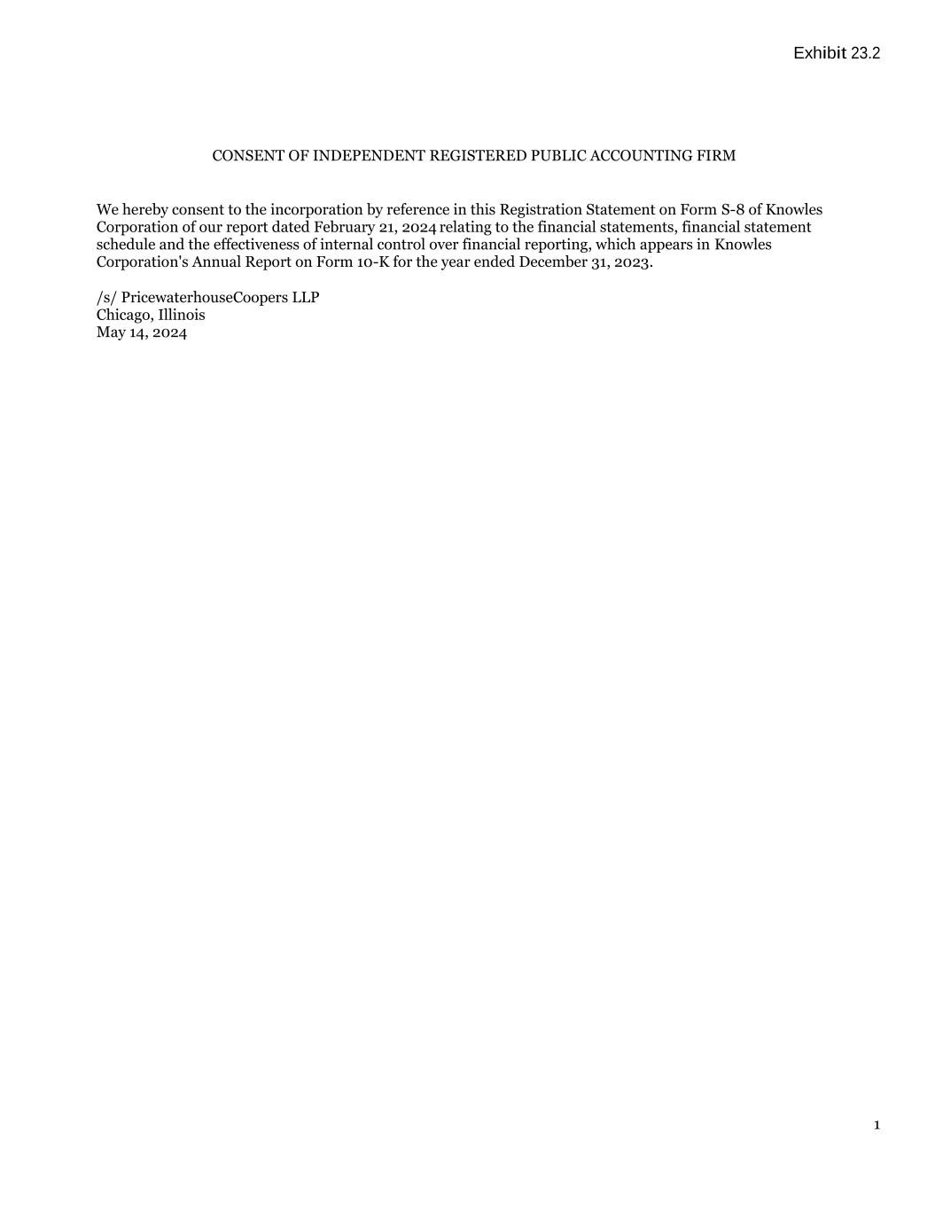 Exhibit 23.2 1 CONSENT OF INDEPENDENT REGISTERED PUBLIC ACCOUNTING FIRM We hereby consent to the incorporation by reference in this Registration Statement on Form S-8 of Knowles Corporation of our report dated February 21, 2024 relating to the financial statements, financial statement schedule and the effectiveness of internal control over financial reporting, which appears in Knowles Corporation's Annual Report on Form 10-K for the year ended December 31, 2023. /s/ PricewaterhouseCoopers LLP Chicago, Illinois May 14, 2024
