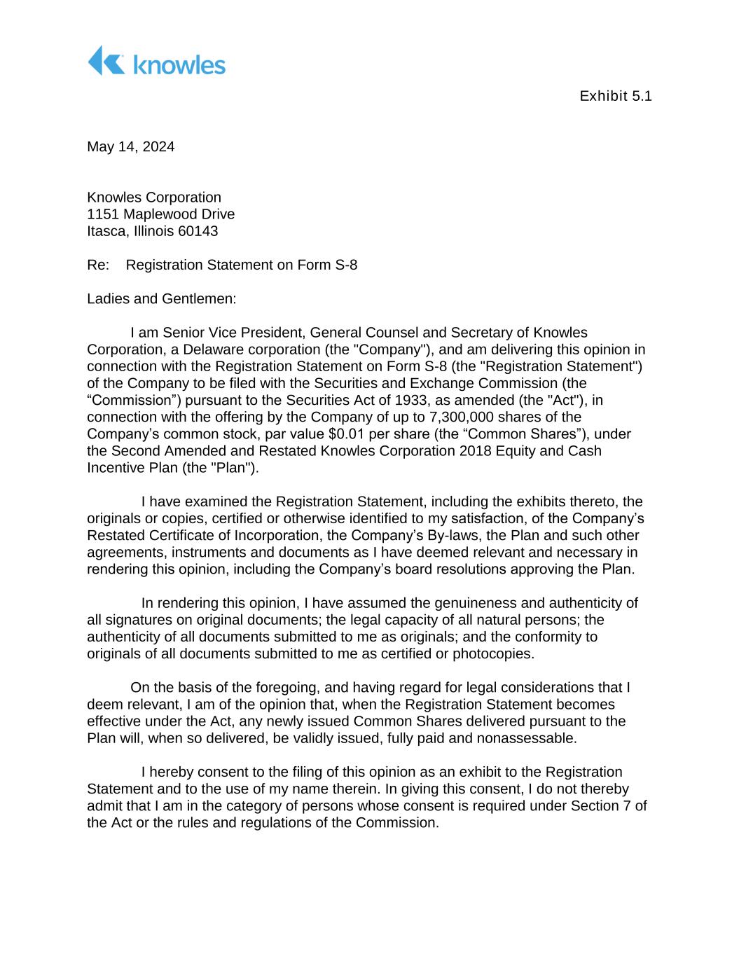 Exhibit 5.1 May 14, 2024 Knowles Corporation 1151 Maplewood Drive Itasca, Illinois 60143 Re: Registration Statement on Form S-8 Ladies and Gentlemen: I am Senior Vice President, General Counsel and Secretary of Knowles Corporation, a Delaware corporation (the "Company"), and am delivering this opinion in connection with the Registration Statement on Form S-8 (the "Registration Statement") of the Company to be filed with the Securities and Exchange Commission (the “Commission”) pursuant to the Securities Act of 1933, as amended (the "Act"), in connection with the offering by the Company of up to 7,300,000 shares of the Company’s common stock, par value $0.01 per share (the “Common Shares”), under the Second Amended and Restated Knowles Corporation 2018 Equity and Cash Incentive Plan (the "Plan"). I have examined the Registration Statement, including the exhibits thereto, the originals or copies, certified or otherwise identified to my satisfaction, of the Company’s Restated Certificate of Incorporation, the Company’s By-laws, the Plan and such other agreements, instruments and documents as I have deemed relevant and necessary in rendering this opinion, including the Company’s board resolutions approving the Plan. In rendering this opinion, I have assumed the genuineness and authenticity of all signatures on original documents; the legal capacity of all natural persons; the authenticity of all documents submitted to me as originals; and the conformity to originals of all documents submitted to me as certified or photocopies. On the basis of the foregoing, and having regard for legal considerations that I deem relevant, I am of the opinion that, when the Registration Statement becomes effective under the Act, any newly issued Common Shares delivered pursuant to the Plan will, when so delivered, be validly issued, fully paid and nonassessable. I hereby consent to the filing of this opinion as an exhibit to the Registration Statement and to the use of my name therein. In giving this consent, I do not thereby admit that I am in the category of persons whose consent is required under Section 7 of the Act or the rules and regulations of the Commission.
