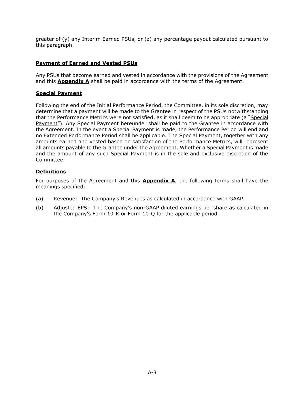 A-3 greater of (y) any Interim Earned PSUs, or (z) any percentage payout calculated pursuant to this paragraph. Payment of Earned and Vested PSUs Any PSUs that become earned and vested in accordance with the provisions of the Agreement and this Appendix A shall be paid in accordance with the terms of the Agreement. Special Payment Following the end of the Initial Performance Period, the Committee, in its sole discretion, may determine that a payment will be made to the Grantee in respect of the PSUs notwithstanding that the Performance Metrics were not satisfied, as it shall deem to be appropriate (a “Special Payment”). Any Special Payment hereunder shall be paid to the Grantee in accordance with the Agreement. In the event a Special Payment is made, the Performance Period will end and no Extended Performance Period shall be applicable. The Special Payment, together with any amounts earned and vested based on satisfaction of the Performance Metrics, will represent all amounts payable to the Grantee under the Agreement. Whether a Special Payment is made and the amount of any such Special Payment is in the sole and exclusive discretion of the Committee. Definitions For purposes of the Agreement and this Appendix A, the following terms shall have the meanings specified: (a) Revenue: The Company's Revenues as calculated in accordance with GAAP. (b) Adjusted EPS: The Company’s non-GAAP diluted earnings per share as calculated in the Company's Form 10-K or Form 10-Q for the applicable period.