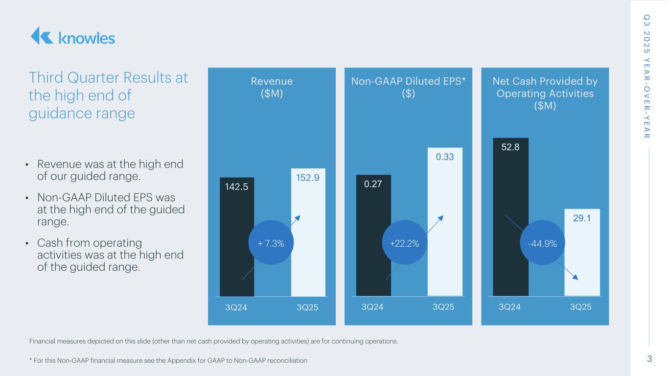 2 Safe Harbor Forward Looking Statements This presentation contains forward-looking statements within the meaning of the safe harbor provisions of the United States Private Securities Litigation Reform Act of 1995, such as statements about our future plans, objectives, expectations, financial performance, and continued business operations. The words "believe," "expect," "anticipate," "project," "estimate," "budget," "continue," "could," "intend," "may," "plan," "potential," "predict," "seek," "should," "will," "would," "objective," "forecast," "goal," "guidance," "outlook," "effort," "target," and similar expressions, among others, generally identify forward-looking statements, which speak only as of the date the statements were made. The statements in this presentation are based on currently available information and the current expectations, forecasts, and assumptions of Knowles’ management concerning risks and uncertainties that could cause actual outcomes or results to differ materially from those outcomes or results that are projected, anticipated, or implied in these statements. Other risks and uncertainties include, but are not limited to: the occurrence of any event, change, or other circumstance giving rise to our inability to achieve some or all of the strategic and financial benefits that we expect to achieve in connection with our CMM divestiture; fluctuations in our stock's market price; fluctuations in operating results and cash flows; our ability to prevent or identify quality issues in our products or to promptly remedy any such issues that are identified; risks associated with increasing our inventories in advance of anticipated orders by customers; global economic instability, including due to inflation, rising interest rates, negative impacts caused by pandemics and public health crises, or the impacts of geopolitical uncertainties; the impact of changes to laws and regulations that affect the Company’s ability to offer products or services to customers in different regions; our ability to achieve reductions in our operating expenses; the ability to qualify our products and facilities with customers; our ability to obtain, enforce, defend or monetize our intellectual property rights; disruption caused by a cybersecurity incident, including a cyber-attack, cyber breach, theft, or other unauthorized access; increases in the costs of critical raw materials and components; availability of raw materials and components; managing new product ramps and introductions for our customers; our dependence on a limited number of large customers; our ability to maintain and expand our existing relationships with leading OEMs in order to maintain and increase our revenue; increasing competition and new entrants in the market for our products; our ability to develop new or enhanced products or technologies in a timely manner that achieve market acceptance; escalating international trade tensions, new or increased tariffs and trade wars among countries; financial risks, including risks relating to currency fluctuations, credit risks and fluctuations in the market value of the Company; a sustained decline in our stock price and market capitalization may result in the impairment of certain intangible or long-lived assets; market risk associated with fluctuations in commodity prices, particularly for various precious metals used in our manufacturing operation, changes in tax laws, changes in tax rates and exposure to additional tax liabilities; and other risks, relevant factors, and uncertainties identified in our Annual Report on Form 10-K for the fiscal year ended December 31, 2024, subsequent Reports on Forms 10-Q and 8-K and our other filings we make with the U.S. Securities and Exchange Commission. Knowles disclaims any intention or obligation to update or revise any forward-looking statements, whether as a result of new information, future events or otherwise, except as required by law. Non-GAAP Disclaimer The financial results disclosed in this presentation include certain measures calculated and presented in accordance with GAAP. In addition to the GAAP results included in this presentation, Knowles has presented supplemental, non-GAAP gross profit, adjusted earnings before interest and income taxes, adjusted earnings before interest and income taxes margin, adjusted earnings before interest, taxes, depreciation, and amortization; adjusted earnings before interest, taxes, depreciation, and amortization margin; non-GAAP gross profit margin, non-GAAP diluted earnings per share, non-GAAP operating expense; free cash flow; and free cash flow margin to facilitate evaluation of Knowles’ operating performance. These non-GAAP financial measures exclude certain amounts that are included in the most directly comparable GAAP measure. In addition, these non-GAAP financial measures do not have standard meanings and may vary from similarly titled non-GAAP financial measures used by other companies. Knowles uses non-GAAP measures as supplements to its GAAP results of operations in evaluating certain aspects of its business, and its executive management team focuses on non-GAAP items as key measures of Knowles’ performance for business planning purposes. These measures assist Knowles in comparing its performance between various reporting periods on a consistent basis, as these measures remove from operating results the impact of items that, in Knowles’ opinion, do not reflect its core operating performance. Knowles believes that its presentation of these non-GAAP financial measures is useful because it provides investors and securities analysts with the same information that Knowles uses internally for purposes of assessing its core operating performance. For a reconciliation of these non-GAAP financial measures to the most directly comparable GAAP financial measures, see the reconciliation tables in the Appendix.