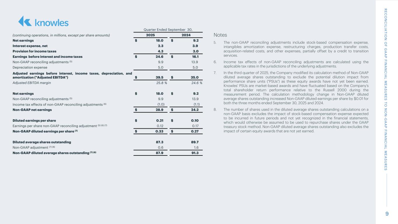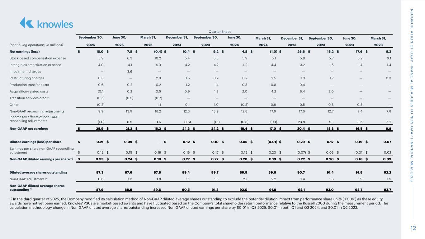 12 Quarter Ended September 30, June 30, March 31, December 31, September 30, June 30, March 31, December 31, September 30, June 30, March 31, (continuing operations, in millions) 2025 2025 2025 2024 2024 2024 2024 2023 2023 2023 2023 Net earnings (loss) $ 18.0 $ 7.8 $ (0.4) $ 10.4 $ 9.2 $ 4.8 $ (1.0) $ 26.6 $ 15.2 $ 17.6 $ 6.2 Stock-based compensation expense 5.9 6.3 10.2 5.4 5.8 5.9 5.1 5.8 5.7 5.2 6.1 Intangibles amortization expense 4.0 4.1 4.0 4.2 4.2 4.2 4.4 3.2 1.5 1.4 1.4 Impairment charges — 3.6 — — — — — — — — — Restructuring charges 0.3 — 2.9 0.5 0.2 0.2 2.5 1.3 1.7 — 0.3 Production transfer costs 0.6 0.2 0.2 1.2 1.4 0.8 0.8 0.4 — — — Acquisition-related costs (0.1) 0.2 0.5 0.9 1.3 2.0 4.2 6.4 3.0 — — Transition services credit (0.5) (0.5) (0.7) — — — — — — — — Other (0.3) — 1.1 0.1 1.0 (0.3) 0.9 0.5 0.8 0.8 — Non-GAAP reconciling adjustments 9.9 13.9 18.2 12.3 13.9 12.8 17.9 17.6 12.7 7.4 7.8 Income tax effects of non-GAAP reconciling adjustments (1.0) 0.5 1.6 (1.6) (1.1) (0.8) (0.1) 23.8 9.1 8.5 5.2 Non-GAAP net earnings $ 28.9 $ 21.2 $ 16.2 $ 24.3 $ 24.2 $ 18.4 $ 17.0 $ 20.4 $ 18.8 $ 16.5 $ 8.8 Diluted earnings (loss) per share $ 0.21 $ 0.09 $ — $ 0.12 $ 0.10 $ 0.05 $ (0.01) $ 0.29 $ 0.17 $ 0.19 $ 0.07 Earnings per share non-GAAP reconciling adjustment $ 0.12 $ 0.15 $ 0.18 $ 0.15 $ 0.17 $ 0.15 $ 0.20 $ (0.07) $ 0.03 $ (0.01) $ 0.02 Non-GAAP diluted earnings per share (1) $ 0.33 $ 0.24 $ 0.18 $ 0.27 $ 0.27 $ 0.20 $ 0.19 $ 0.22 $ 0.20 $ 0.18 $ 0.09 Diluted average shares outstanding 87.3 87.6 87.8 89.4 89.7 89.9 89.6 90.7 91.4 91.8 92.2 Non-GAAP adjustment (1) 0.6 1.3 1.8 1.1 1.6 2.1 2.2 1.4 1.6 1.9 1.5 Non-GAAP diluted average shares outstanding (1) 87.9 88.9 89.6 90.5 91.3 92.0 91.8 92.1 93.0 93.7 93.7 (1) In the third quarter of 2025, the Company modified its calculation method of Non-GAAP diluted average shares outstanding to exclude the potential dilution impact from performance share units ("PSUs") as these equity awards have not yet been earned. Knowles' PSUs are market-based awards and have fluctuated based on the Company's total shareholder return performance relative to the Russell 2000 during the measurement period. The calculation methodology change in Non-GAAP diluted average shares outstanding increased Non-GAAP diluted earnings per share by $0.01 in Q3 2025, $0.01 in both Q1 and Q3 2024, and $0.01 in Q2 2023. R EC O N C ILIA TIO N O F G A A P FIN A N C IA L M EA S U R ES TO N O N -G A A P FIN A N C IA L M EA S U R ES