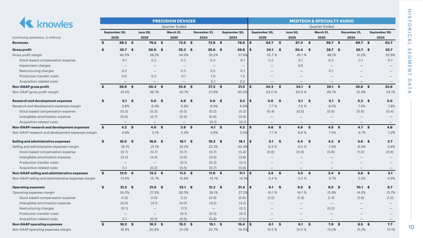 9 R EC O N C ILIA TIO N O F G A A P FIN A N C IA L M EA S U R ES TO N O N -G A A P FIN A N C IA L M EA S U R ES Notes 5. The non-GAAP reconciling adjustments include stock-based compensation expense, intangibles amortization expense, restructuring charges, production transfer costs, acquisition-related costs, and other expenses, partially offset by a credit to transition services. 6. Income tax effects of non-GAAP reconciling adjustments are calculated using the applicable tax rates in the jurisdictions of the underlying adjustments. 7. In the third quarter of 2025, the Company modified its calculation method of Non-GAAP diluted average shares outstanding to exclude the potential dilution impact from performance share units ("PSUs") as these equity awards have not yet been earned. Knowles' PSUs are market-based awards and have fluctuated based on the Company's total shareholder return performance relative to the Russell 2000 during the measurement period. The calculation methodology change in Non-GAAP diluted average shares outstanding increased Non-GAAP diluted earnings per share by $0.01 for both the three months ended September 30, 2025 and 2024. 8. The number of shares used in the diluted average shares outstanding calculations on a non-GAAP basis excludes the impact of stock-based compensation expense expected to be incurred in future periods and not yet recognized in the financial statements, which would otherwise be assumed to be used to repurchase shares under the GAAP treasury stock method. Non-GAAP diluted average shares outstanding also excludes the impact of certain equity awards that are not yet earned. Quarter Ended September 30, (continuing operations, in millions, except per share amounts) 2025 2024 Net earnings $ 18.0 $ 9.2 Interest expense, net 2.3 3.9 Provision for income taxes 4.3 3.0 Earnings before interest and income taxes $ 24.6 $ 16.1 Non-GAAP reconciling adjustments (5) 9.9 13.9 Depreciation expense 5.0 5.0 Adjusted earnings before interest, income taxes, depreciation, and amortization ("Adjusted EBITDA") $ 39.5 $ 35.0 Adjusted EBITDA margin 25.8 % 24.6 % Net earnings $ 18.0 $ 9.2 Non-GAAP reconciling adjustments (5) 9.9 13.9 Income tax effects of non-GAAP reconciling adjustments (6) (1.0) (1.1) Non-GAAP net earnings $ 28.9 $ 24.2 Diluted earnings per share $ 0.21 $ 0.10 Earnings per share non-GAAP reconciling adjustment (5) (6) (7) 0.12 0.17 Non-GAAP diluted earnings per share (7) $ 0.33 $ 0.27 Diluted average shares outstanding 87.3 89.7 Non-GAAP adjustment (7) (8) 0.6 1.6 Non-GAAP diluted average shares outstanding (7) (8) 87.9 91.3