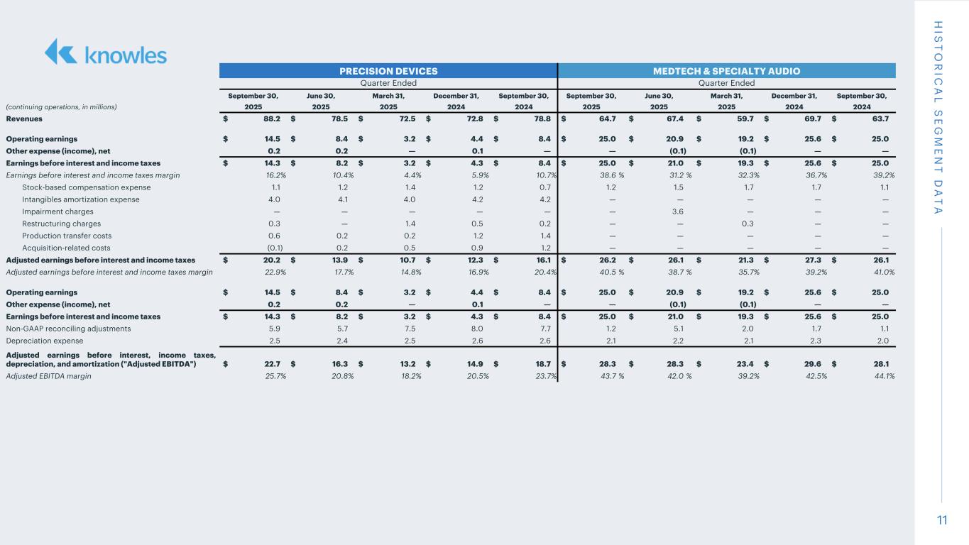 10 H IS T O R IC A L S E G M E N T D A T A PRECISION DEVICES MEDTECH & SPECIALTY AUDIO Quarter Ended Quarter Ended September 30, June 30, March 31, December 31, September 30, September 30, June 30, March 31, December 31, September 30, (continuing operations, in millions) 2025 2025 2025 2024 2024 2025 2025 2025 2024 2024 Revenues $ 88.2 $ 78.5 $ 72.5 $ 72.8 $ 78.8 $ 64.7 $ 67.4 $ 59.7 $ 69.7 $ 63.7 Gross profit $ 35.7 $ 30.0 $ 25.3 $ 25.6 $ 29.8 $ 34.1 $ 30.4 $ 28.7 $ 35.7 $ 33.7 Gross profit margin 40.5 % 38.2 % 34.9 % 35.2 % 37.8 % 52.7 % 45.1 % 48.1 % 51.2 % 52.9 % Stock-based compensation expense 0.1 0.2 0.2 0.3 0.1 0.2 0.1 0.3 0.1 0.1 Impairment charges — — — — — — 3.6 — — — Restructuring charges 0.2 — 0.3 0.5 0.1 — — 0.1 — — Production transfer costs 0.6 0.2 0.1 1.0 1.3 — — — — — Acquisition-related costs — — — 0.1 0.2 — — — — — Non-GAAP gross profit $ 36.6 $ 30.4 $ 25.9 $ 27.5 $ 31.5 $ 34.3 $ 34.1 $ 29.1 $ 35.8 $ 33.8 Non-GAAP gross profit margin 41.5 % 38.7 % 35.7 % 37.8 % 40.0 % 53.0 % 50.6 % 48.7 % 51.4 % 53.1 % Research and development expenses $ 5.1 $ 5.0 $ 4.9 $ 5.0 $ 5.2 $ 5.0 $ 5.1 $ 5.1 $ 5.3 $ 5.0 Research and development expenses margin 5.8 % 6.4 % 6.8 % 6.9 % 6.6 % 7.7 % 7.6 % 8.5 % 7.6 % 7.8 % Stock-based compensation expense (0.3) (0.3) (0.5) (0.2) (0.2) (0.4) (0.5) (0.6) (0.6) (0.4) Intangibles amortization expense (0.6) (0.7) (0.5) (0.6) (0.6) — — — — — Acquisition-related costs — — — (0.1) (0.1) — — — — — Non-GAAP research and development expenses $ 4.2 $ 4.0 $ 3.9 $ 4.1 $ 4.3 $ 4.6 $ 4.6 $ 4.5 $ 4.7 $ 4.6 Non-GAAP research and development expenses margin 4.8 % 5.1 % 5.4 % 5.6 % 5.5 % 7.1 % 6.8 % 7.5 % 6.7 % 7.2 % Selling and administrative expenses $ 16.0 $ 16.6 $ 16.1 $ 16.2 $ 16.1 $ 4.1 $ 4.4 $ 4.2 $ 4.8 $ 3.7 Selling and administrative expenses margin 18.1 % 21.1 % 22.2 % 22.3 % 20.4 % 6.3 % 6.5 % 7.0 % 6.9 % 5.8 % Stock-based compensation expense (0.7) (0.7) (0.7) (0.7) (0.4) (0.6) (0.9) (0.8) (1.0) (0.6) Intangibles amortization expense (3.4) (3.4) (3.5) (3.6) (3.6) — — — — — Production transfer costs — — (0.1) (0.2) (0.1) — — — — — Acquisition-related costs 0.1 (0.2) (0.5) (0.7) (0.9) — — — — — Non-GAAP selling and administrative expenses $ 12.0 $ 12.3 $ 11.3 $ 11.0 $ 11.1 $ 3.5 $ 3.5 $ 3.4 $ 3.8 $ 3.1 Non-GAAP selling and administrative expenses margin 13.6 % 15.7 % 15.6 % 15.1 % 14.1 % 5.4 % 5.2 % 5.7 % 5.5 % 4.9 % Operating expenses $ 21.2 $ 21.6 $ 22.1 $ 21.2 $ 21.4 $ 9.1 $ 9.5 $ 9.5 $ 10.1 $ 8.7 Operating expenses margin 24.0 % 27.5 % 30.5 % 29.1 % 27.2 % 14.1 % 14.1 % 15.9 % 14.5 % 13.7 % Stock-based compensation expense (1.0) (1.0) (1.2) (0.9) (0.6) (1.0) (1.4) (1.4) (1.6) (1.0) Intangibles amortization expense (4.0) (4.1) (4.0) (4.2) (4.2) — — — — — Restructuring charges (0.1) — (1.1) — (0.1) — — (0.2) — — Production transfer costs — — (0.1) (0.2) (0.1) — — — — — Acquisition-related costs 0.1 (0.2) (0.5) (0.8) (1.0) — — — — — Non-GAAP operating expenses $ 16.2 $ 16.3 $ 15.2 $ 15.1 $ 15.4 $ 8.1 $ 8.1 $ 7.9 $ 8.5 $ 7.7 Non-GAAP operating expenses margin 18.4 % 20.8 % 21.0 % 20.7 % 19.5 % 12.5 % 12.0 % 13.2 % 12.2 % 12.1 %