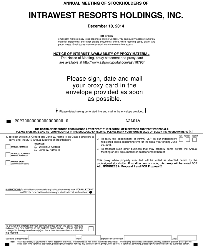 ANNUAL MEETING OF STOCKHOLDERS OF INTRAWEST RESORTS HOLDINGS, INC. December 10, 2014 GO GREEN e-Consent makes it easy to go paperless. With e-Consent, you can quickly access your proxy material, statements and other eligible documents online, while reducing costs, clutter and paper waste. Enroll today via www.amstock.com to enjoy online access. NOTICE OF INTERNET AVAILABILITY OF PROXY MATERIAL: The Notice of Meeting, proxy statement and proxy card are available at http://www.astproxyportal.com/ast/18793/ Please sign, date and mail your proxy card in the envelope provided as soon as possible. Please detach along perforated line and mail in the envelope provided. 20230000000000000000 0 121014 THE BOARD OF DIRECTORS RECOMMENDS A VOTE "FOR" THE ELECTION OF DIRECTORS AND "FOR" PROPOSAL 2. PLEASE SIGN, DATE AND RETURN PROMPTLY IN THE ENCLOSED ENVELOPE. PLEASE MARK YOUR VOTE IN BLUE OR BLACK INK AS SHOWN HERE 1. To elect William J. Clifford and John W. Harris III as Class I directors to serve until the 2017 Annual Meeting of Stockholders NOMINEES: FOR ALL NOMINEES William J. Clifford John W. Harris III WITHHOLD AUTHORITY FOR ALL NOMINEES FOR ALL EXCEPT (See instructions below) INSTRUCTIONS: To withhold authority to vote for any individual nominee(s), mark “FOR ALL EXCEPT” and fill in the circle next to each nominee you wish to withhold, as shown here: FOR AGAINST ABSTAIN 2. To ratify the appointment of KPMG LLP as our independent registered public accounting firm for the fiscal year ending June 30, 2015 3. To transact such other business that may properly come before the Annual Meeting or any adjournment or postponement thereof This proxy when properly executed will be voted as directed herein by the undersigned stockholder. If no direction is made, this proxy will be voted FOR ALL NOMINEES in Proposal 1 and FOR Proposal 2. To change the address on your account, please check the box at right and indicate your new address in the address space above. Please note that changes to the registered name(s) on the account may not be submitted via this method. Signature of Stockholder Date: Signature of Stockholder Date: Note: Please sign exactly as your name or names appear on this Proxy. When shares are held jointly, each holder should sign. When signing as executor, administrator, attorney, trustee or guardian, please give full title as such. If the signer is a corporation, please sign full corporate name by duly authorized officer, giving full title as such. If signer is a partnership, please sign in partnership name by authorized person.