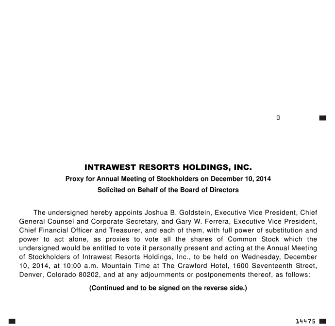 0 INTRAWEST RESORTS HOLDINGS, INC. Proxy for Annual Meeting of Stockholders on December 10, 2014 Solicited on Behalf of the Board of Directors The undersigned hereby appoints Joshua B. Goldstein, Executive Vice President, Chief General Counsel and Corporate Secretary, and Gary W. Ferrera, Executive Vice President, Chief Financial Officer and Treasurer, and each of them, with full power of substitution and power to act alone, as proxies to vote all the shares of Common Stock which the undersigned would be entitled to vote if personally present and acting at the Annual Meeting of Stockholders of Intrawest Resorts Holdings, Inc., to be held on Wednesday, December 10, 2014, at 10:00 a.m. Mountain Time at The Crawford Hotel, 1600 Seventeenth Street, Denver, Colorado 80202, and at any adjournments or postponements thereof, as follows: (Continued and to be signed on the reverse side.) 14475