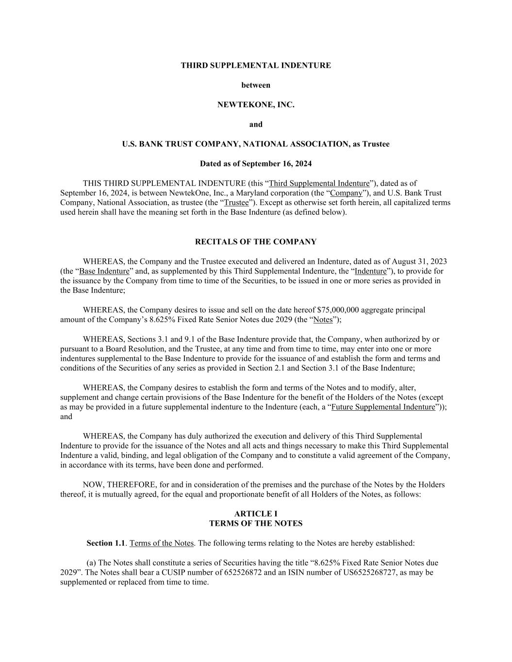 THIRD SUPPLEMENTAL INDENTURE between NEWTEKONE, INC. and U.S. BANK TRUST COMPANY, NATIONAL ASSOCIATION, as Trustee Dated as of September 16, 2024 THIS THIRD SUPPLEMENTAL INDENTURE (this “Third Supplemental Indenture”), dated as of September 16, 2024, is between NewtekOne, Inc., a Maryland corporation (the “Company”), and U.S. Bank Trust Company, National Association, as trustee (the “Trustee”). Except as otherwise set forth herein, all capitalized terms used herein shall have the meaning set forth in the Base Indenture (as defined below). RECITALS OF THE COMPANY WHEREAS, the Company and the Trustee executed and delivered an Indenture, dated as of August 31, 2023 (the “Base Indenture” and, as supplemented by this Third Supplemental Indenture, the “Indenture”), to provide for the issuance by the Company from time to time of the Securities, to be issued in one or more series as provided in the Base Indenture; WHEREAS, the Company desires to issue and sell on the date hereof $75,000,000 aggregate principal amount of the Company’s 8.625% Fixed Rate Senior Notes due 2029 (the “Notes”); WHEREAS, Sections 3.1 and 9.1 of the Base Indenture provide that, the Company, when authorized by or pursuant to a Board Resolution, and the Trustee, at any time and from time to time, may enter into one or more indentures supplemental to the Base Indenture to provide for the issuance of and establish the form and terms and conditions of the Securities of any series as provided in Section 2.1 and Section 3.1 of the Base Indenture; WHEREAS, the Company desires to establish the form and terms of the Notes and to modify, alter, supplement and change certain provisions of the Base Indenture for the benefit of the Holders of the Notes (except as may be provided in a future supplemental indenture to the Indenture (each, a “Future Supplemental Indenture”)); and WHEREAS, the Company has duly authorized the execution and delivery of this Third Supplemental Indenture to provide for the issuance of the Notes and all acts and things necessary to make this Third Supplemental Indenture a valid, binding, and legal obligation of the Company and to constitute a valid agreement of the Company, in accordance with its terms, have been done and performed. NOW, THEREFORE, for and in consideration of the premises and the purchase of the Notes by the Holders thereof, it is mutually agreed, for the equal and proportionate benefit of all Holders of the Notes, as follows: ARTICLE I TERMS OF THE NOTES Section 1.1. Terms of the Notes. The following terms relating to the Notes are hereby established: (a) The Notes shall constitute a series of Securities having the title “8.625% Fixed Rate Senior Notes due 2029”. The Notes shall bear a CUSIP number of 652526872 and an ISIN number of US6525268727, as may be supplemented or replaced from time to time.