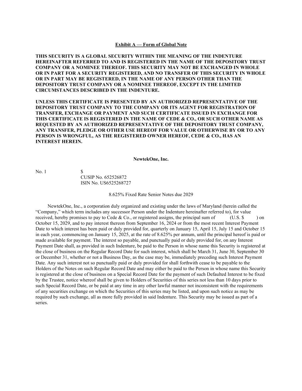 Exhibit A — Form of Global Note THIS SECURITY IS A GLOBAL SECURITY WITHIN THE MEANING OF THE INDENTURE HEREINAFTER REFERRED TO AND IS REGISTERED IN THE NAME OF THE DEPOSITORY TRUST COMPANY OR A NOMINEE THEREOF. THIS SECURITY MAY NOT BE EXCHANGED IN WHOLE OR IN PART FOR A SECURITY REGISTERED, AND NO TRANSFER OF THIS SECURITY IN WHOLE OR IN PART MAY BE REGISTERED, IN THE NAME OF ANY PERSON OTHER THAN THE DEPOSITORY TRUST COMPANY OR A NOMINEE THEREOF, EXCEPT IN THE LIMITED CIRCUMSTANCES DESCRIBED IN THE INDENTURE. UNLESS THIS CERTIFICATE IS PRESENTED BY AN AUTHORIZED REPRESENTATIVE OF THE DEPOSITORY TRUST COMPANY TO THE COMPANY OR ITS AGENT FOR REGISTRATION OF TRANSFER, EXCHANGE OR PAYMENT AND SUCH CERTIFICATE ISSUED IN EXCHANGE FOR THIS CERTIFICATE IS REGISTERED IN THE NAME OF CEDE & CO., OR SUCH OTHER NAME AS REQUESTED BY AN AUTHORIZED REPRESENTATIVE OF THE DEPOSITORY TRUST COMPANY, ANY TRANSFER, PLEDGE OR OTHER USE HEREOF FOR VALUE OR OTHERWISE BY OR TO ANY PERSON IS WRONGFUL, AS THE REGISTERED OWNER HEREOF, CEDE & CO., HAS AN INTEREST HEREIN. NewtekOne, Inc. No. 1 $ CUSIP No. 652526872 ISIN No. US6525268727 8.625% Fixed Rate Senior Notes due 2029 NewtekOne, Inc., a corporation duly organized and existing under the laws of Maryland (herein called the “Company,” which term includes any successor Person under the Indenture hereinafter referred to), for value received, hereby promises to pay to Cede & Co., or registered assigns, the principal sum of (U.S. $ ) on October 15, 2029, and to pay interest thereon from September 16, 2024 or from the most recent Interest Payment Date to which interest has been paid or duly provided for, quarterly on January 15, April 15, July 15 and October 15 in each year, commencing on January 15, 2025, at the rate of 8.625% per annum, until the principal hereof is paid or made available for payment. The interest so payable, and punctually paid or duly provided for, on any Interest Payment Date shall, as provided in such Indenture, be paid to the Person in whose name this Security is registered at the close of business on the Regular Record Date for such interest, which shall be March 31, June 30, September 30 or December 31, whether or not a Business Day, as the case may be, immediately preceding such Interest Payment Date. Any such interest not so punctually paid or duly provided for shall forthwith cease to be payable to the Holders of the Notes on such Regular Record Date and may either be paid to the Person in whose name this Security is registered at the close of business on a Special Record Date for the payment of such Defaulted Interest to be fixed by the Trustee, notice whereof shall be given to Holders of Securities of this series not less than 10 days prior to such Special Record Date, or be paid at any time in any other lawful manner not inconsistent with the requirements of any securities exchange on which the Securities of this series may be listed, and upon such notice as may be required by such exchange, all as more fully provided in said Indenture. This Security may be issued as part of a series.