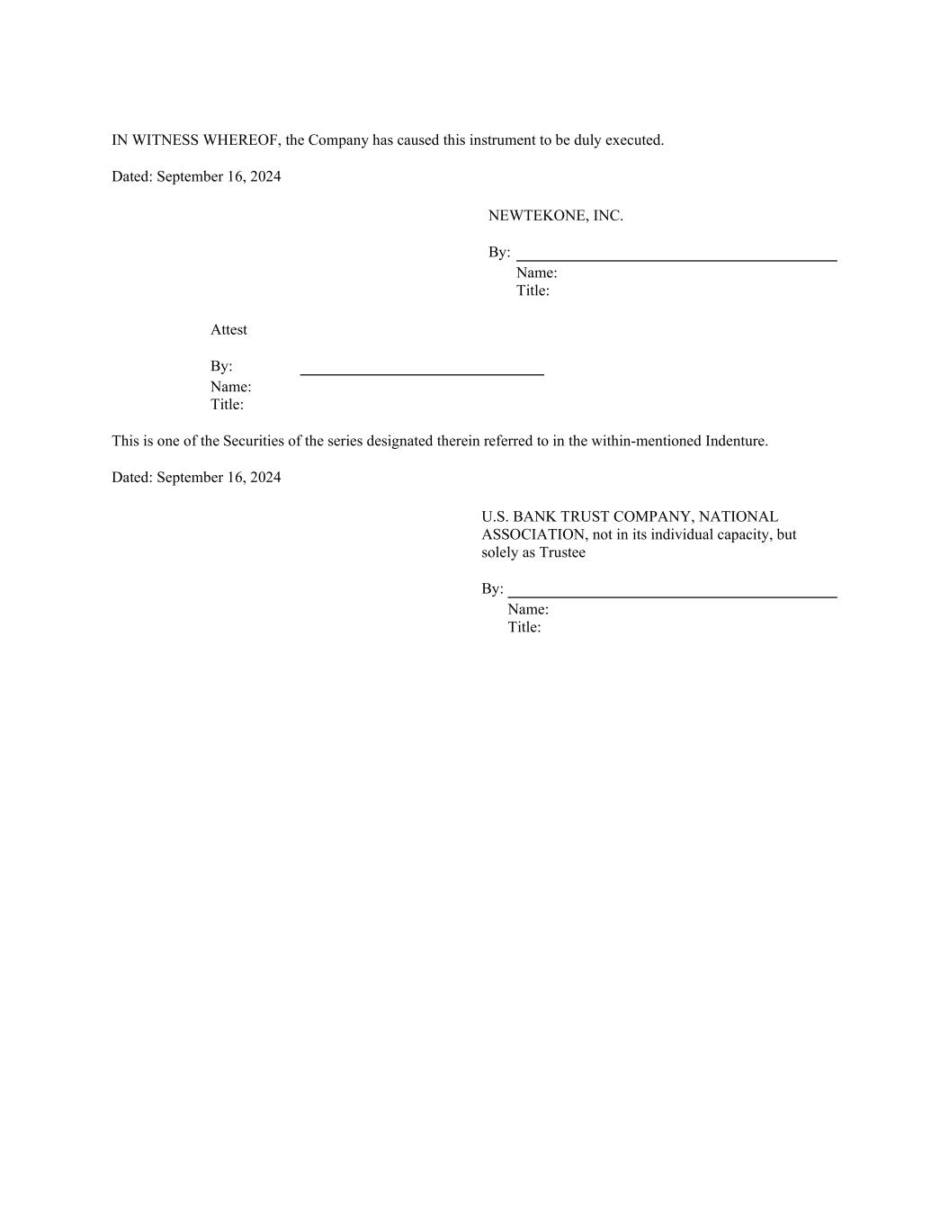 IN WITNESS WHEREOF, the Company has caused this instrument to be duly executed. Dated: September 16, 2024 NEWTEKONE, INC. By: Name: Title: Attest By: Name: Title: This is one of the Securities of the series designated therein referred to in the within-mentioned Indenture. Dated: September 16, 2024 U.S. BANK TRUST COMPANY, NATIONAL ASSOCIATION, not in its individual capacity, but solely as Trustee By: Name: Title: