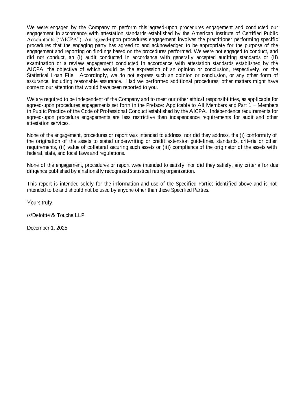 We were engaged by the Company to perform this agreed-upon procedures engagement and conducted our engagement in accordance with attestation standards established by the American Institute of Certified Public Accountants (“AICPA”). An agreed-upon procedures engagement involves the practitioner performing specific procedures that the engaging party has agreed to and acknowledged to be appropriate for the purpose of the engagement and reporting on findings based on the procedures performed. We were not engaged to conduct, and did not conduct, an (i) audit conducted in accordance with generally accepted auditing standards or (ii) examination or a review engagement conducted in accordance with attestation standards established by the AICPA, the objective of which would be the expression of an opinion or conclusion, respectively, on the Statistical Loan File. Accordingly, we do not express such an opinion or conclusion, or any other form of assurance, including reasonable assurance. Had we performed additional procedures, other matters might have come to our attention that would have been reported to you. We are required to be independent of the Company and to meet our other ethical responsibilities, as applicable for agreed-upon procedures engagements set forth in the Preface: Applicable to All Members and Part 1 – Members in Public Practice of the Code of Professional Conduct established by the AICPA. Independence requirements for agreed-upon procedure engagements are less restrictive than independence requirements for audit and other attestation services. None of the engagement, procedures or report was intended to address, nor did they address, the (i) conformity of the origination of the assets to stated underwriting or credit extension guidelines, standards, criteria or other requirements, (ii) value of collateral securing such assets or (iii) compliance of the originator of the assets with federal, state, and local laws and regulations. None of the engagement, procedures or report were intended to satisfy, nor did they satisfy, any criteria for due diligence published by a nationally recognized statistical rating organization. This report is intended solely for the information and use of the Specified Parties identified above and is not intended to be and should not be used by anyone other than these Specified Parties. Yours truly, /s/Deloitte & Touche LLP December 1, 2025