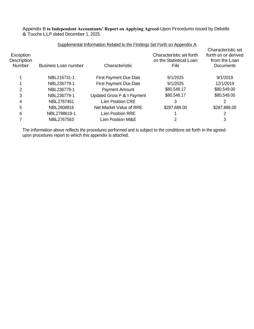 Appendix B to Independent Accountants’ Report on Applying Agreed-Upon Procedures issued by Deloitte & Touche LLP dated December 1, 2025. Supplemental Information Related to the Findings Set Forth on Appendix A Exception Description Number Business Loan number Characteristic Characteristic set forth on the Statistical Loan File Characteristic set forth on or derived from the Loan Documents 1 NBL216731-1 First Payment Due Date 9/1/2025 9/1/2019 1 NBL236779-1 First Payment Due Date 9/1/2025 12/1/2019 2 NBL236779-1 Payment Amount $80,548.17 $80,549.00 3 NBL236779-1 Updated Gross P & I Payment $80,548.17 $80,549.00 4 NBL2767461 Lien Position CRE 3 2 5 NBL2808816 Net Market Value of RRE $287,686.00 $287,886.00 6 NBL2798619-1 Lien Position RRE 1 2 7 NBL2767563 Lien Position M&E 2 3 The information above reflects the procedures performed and is subject to the conditions set forth in the agreed- upon procedures report to which this appendix is attached.