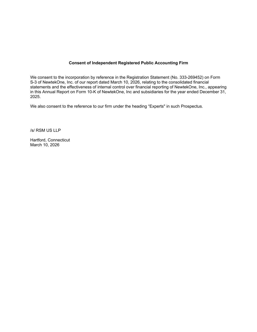 Consent of Independent Registered Public Accounting Firm We consent to the incorporation by reference in the Registration Statement (No. 333-269452) on Form S-3 of NewtekOne, Inc. of our report dated March 10, 2026, relating to the consolidated financial statements and the effectiveness of internal control over financial reporting of NewtekOne, Inc., appearing in this Annual Report on Form 10-K of NewtekOne, Inc and subsidiaries for the year ended December 31, 2025. We also consent to the reference to our firm under the heading “Experts" in such Prospectus. /s/ RSM US LLP Hartford, Connecticut March 10, 2026
