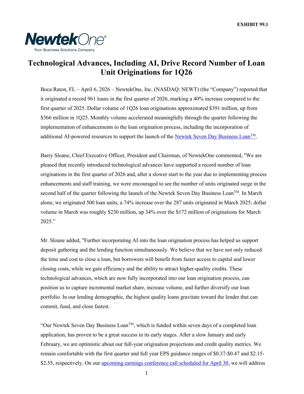 1 Technological Advances, Including AI, Drive Record Number of Loan Unit Originations for 1Q26 Boca Raton, FL – April 6, 2026 – NewtekOne, Inc. (NASDAQ: NEWT) (the “Company”) reported that it originated a record 961 loans in the first quarter of 2026, marking a 40% increase compared to the first quarter of 2025. Dollar volume of 1Q26 loan originations approximated $391 million, up from $366 million in 1Q25. Monthly volume accelerated meaningfully through the quarter following the implementation of enhancements to the loan origination process, including the incorporation of additional AI-powered resources to support the launch of the Newtek Seven Day Business LoanTM. Barry Sloane, Chief Executive Officer, President and Chairman, of NewtekOne commented, "We are pleased that recently introduced technological advances have supported a record number of loan originations in the first quarter of 2026 and, after a slower start to the year due to implementing process enhancements and staff training, we were encouraged to see the number of units originated surge in the second half of the quarter following the launch of the Newtek Seven Day Business LoanTM. In March alone, we originated 500 loan units, a 74% increase over the 287 units originated in March 2025; dollar volume in March was roughly $230 million, up 34% over the $172 million of originations for March 2025.” Mr. Sloane added, "Further incorporating AI into the loan origination process has helped us support deposit gathering and the lending function simultaneously. We believe that we have not only reduced the time and cost to close a loan, but borrowers will benefit from faster access to capital and lower closing costs, while we gain efficiency and the ability to attract higher-quality credits. These technological advances, which are now fully incorporated into our loan origination process, can position us to capture incremental market share, increase volume, and further diversify our loan portfolio. In our lending demographic, the highest quality loans gravitate toward the lender that can commit, fund, and close fastest. “Our Newtek Seven Day Business LoanTM, which is funded within seven days of a completed loan application, has proven to be a great success in its early stages. After a slow January and early February, we are optimistic about our full-year origination projections and credit quality metrics. We remain comfortable with the first quarter and full year EPS guidance ranges of $0.37-$0.47 and $2.15- $2.55, respectively. On our upcoming earnings conference call scheduled for April 30, we will address