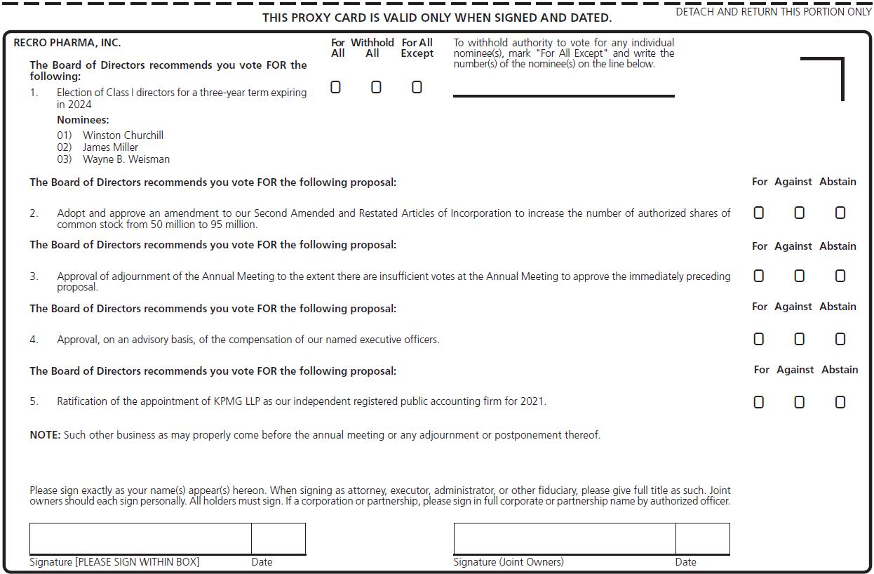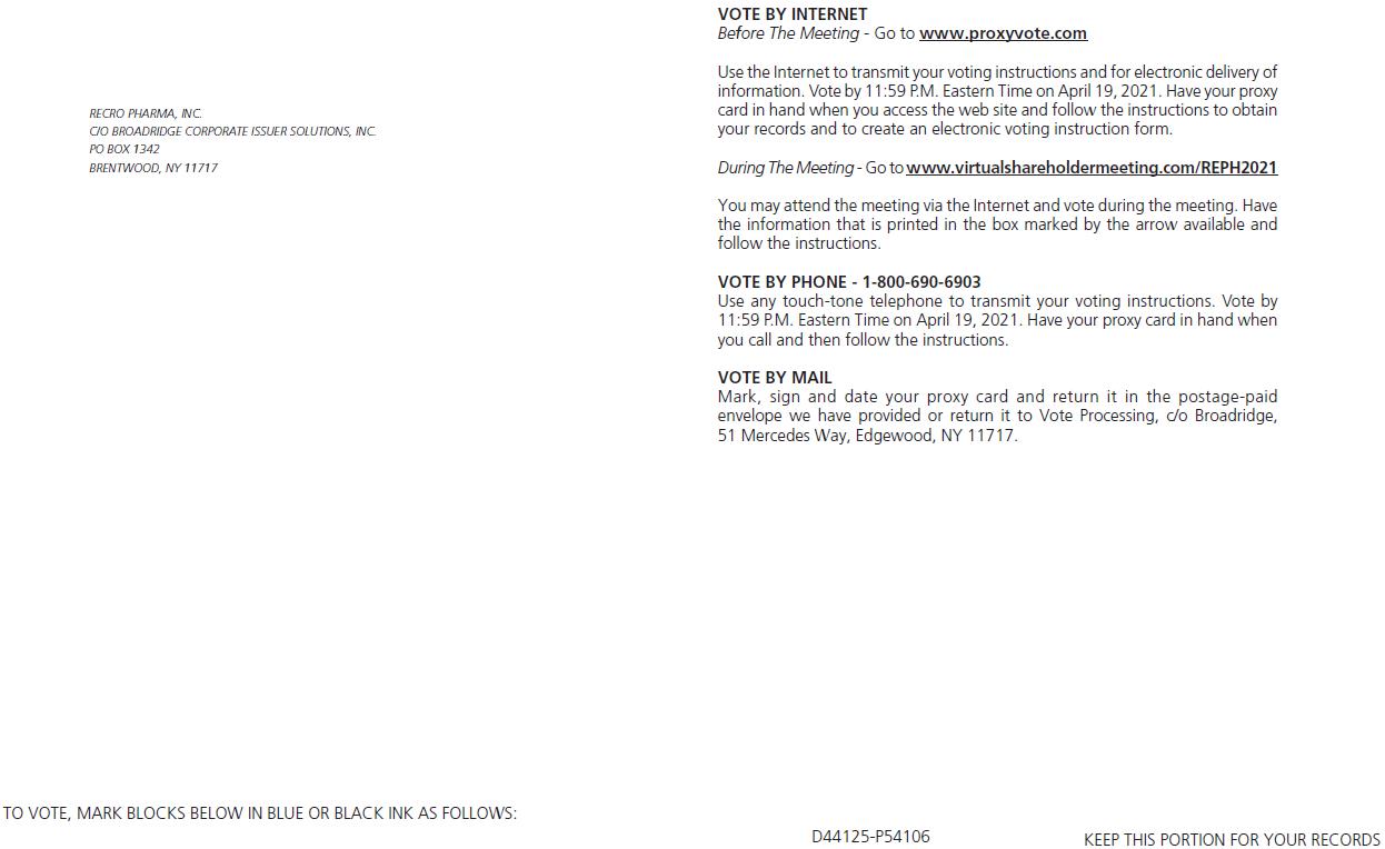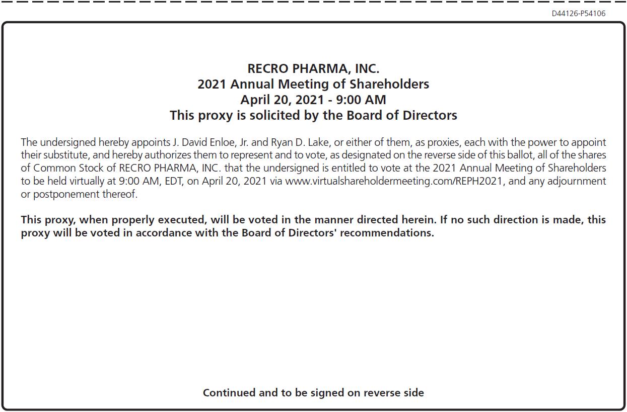We are pleased to invite you to attend Recro Pharma, Inc.’s, or Recro’s, or the Company’s, 2021 Annual Meeting of Shareholders, or Annual Meeting, which will be held at 9:00 a.m., Eastern time, on Tuesday, April 20, 2021. We have decided to hold the Annual Meeting virtually this year due to the public health impact of COVID-19 and to support the health and well-being of our business partners, employees and shareholders. We believe that hosting the Annual Meeting virtually under the current environment will enable greater shareholder attendance and participation and improves our ability to communicate more effectively with our shareholders. The Annual Meeting can be accessed via the Internet at: www.virtualshareholdermeeting.com/REPH2021.