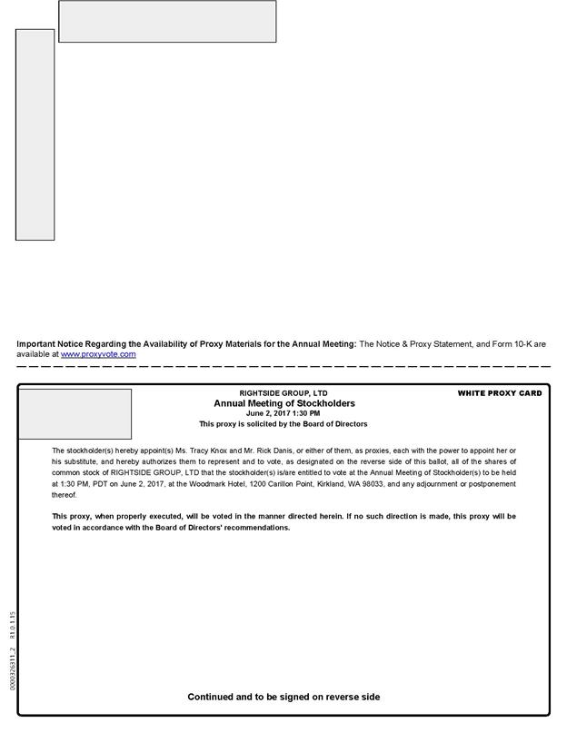 0000326311_2 R1.0.1.15 Important Notice Regarding the Availability of Proxy Materials for the Annual Meeting: The Notice & Proxy Statement, and Form 10-K areavailable atwww.proxyvote.com RIGHTSIDE GROUP, LTD Annual Meeting of Stockholders June 2, 2017 1:30 PM This proxy is solicited by the Board of Directors The stock holder(s)here by appoint(s)Ms.Tracy Knox and Mr.Rick Danis, or either of them, as proxies, each with the power to appoint her or his substitute, and here by authorizes them to represent and to vote, as designated on the reverse side of this ballot, all of the shares of common stock of RIGHTSIDE GROUP, LTD that the stock holder(s) is/are entitled to vote at the Annual Meeting of Stockholder(s) to be held at 1:30 PM, PDT on June 2, 2017, at the Woodmark Hotel, 1200 Carillon Point, Kirkland, WA 98033, and any adjournment or postponement thereof. This proxy, when properly executed, will be voted in the manner directed herein. If no such direction is made, this proxy will be voted in accordance with the Board of Directors' recommendations. Continued and to be signed on reverse side WHITE PROXY CARD