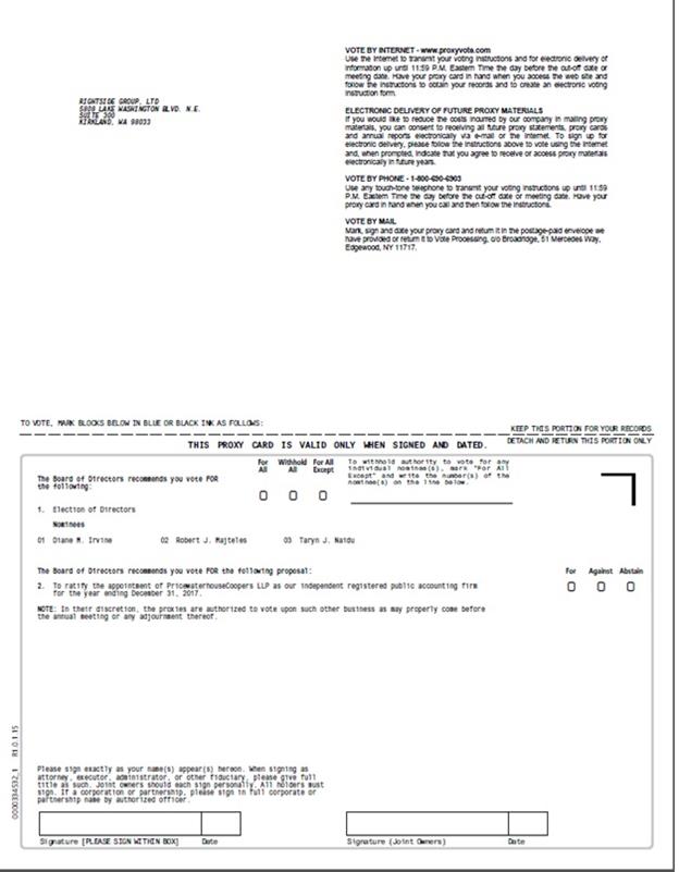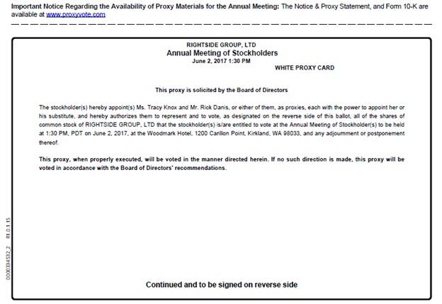 Important Notice Regarding the Availability of Proxy Materials for the Annual Meeting: The Notice & Proxy Statement, and Form 10-K are available at www.proxyvote.com RIGHTSIDE GROUP, LTD Annual Meeting of Stockholders June 2, 2017 1:30 PM WHITE PROXY CARD This proxy is solicited by the Board of Directors The stockholder(s) hereby appoint(s) Ms. Tracy Knox and Mr. Rick Danis, or either of them, as proxies, each with the power to appoint her or his substitute, and hereby authorizes them to represent and to vote, as designated on the reverse side of this ballot, all of the shares of common stock of RIGHTSIDE GROUP, LTD that the stockholder(s) is/are entitled to vote at the Annual Meeting of Stockholder(s) to be held at 1:30 PM, PDT on June 2, 2017, at the Woodmark Hotel, 1200 Carillon Point, Kirkland, WA 98033, and any adjournment or postponement thereof. This proxy, when properly executed, will be voted in the manner directed herein. If no such direction is made, this proxy will be voted in accordance with the Board of Directors' recommendations. Continued and to be signed on reverse side 0000334532_2 R1.0.1.15