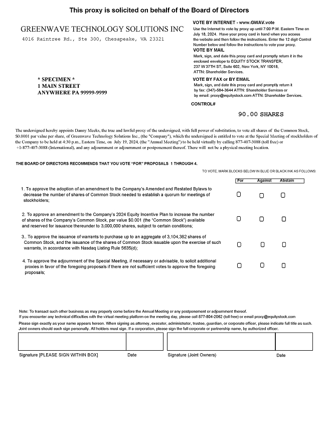 NOTICE IS HEREBY GIVEN that a Special Meeting of Stockholders (the “Special Meeting”) of Greenwave Technology Solutions, Inc., a Delaware corporation (the “Company”), will be held on July 19, 2024 at 4:30 p.m. Eastern Time. The Special Meeting will be a virtual meeting to be held as a listen-only conference call by calling 877-407-3088 (Toll Free) or by visiting www.GWAV.vote. There will not be a physical meeting location. If you encounter any technical difficulties with the virtual meeting platform on the meeting day, please call 877-804-2062 (toll free) or email proxy@equitystock.com.