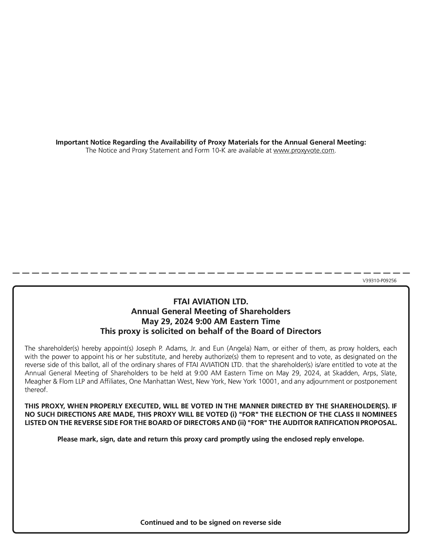 On behalf of the Board of Directors, I cordially invite you to attend the Annual General Meeting of Shareholders of FTAI Aviation Ltd. (the “Annual General Meeting”) to be held at Skadden, Arps, Slate, Meagher & Flom LLP and Affiliates, One Manhattan West, New York, New York 10001, on May 29, 2024, at 9:00 a.m., Eastern Time. The matters to be considered by the shareholders at the Annual General Meeting are described in detail in the accompanying materials.